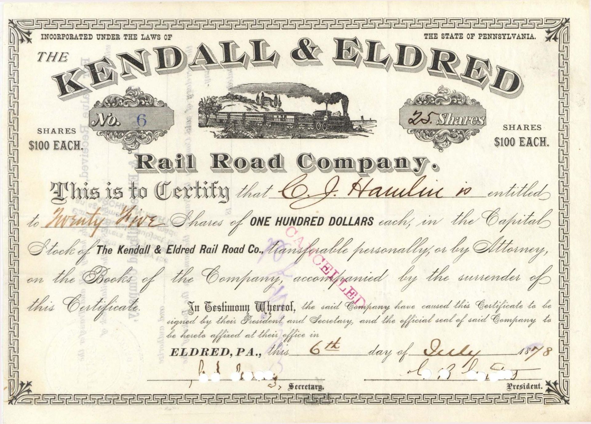 Kendall and Eldred Rail Road Co. - 1878 dated Stock Certificate