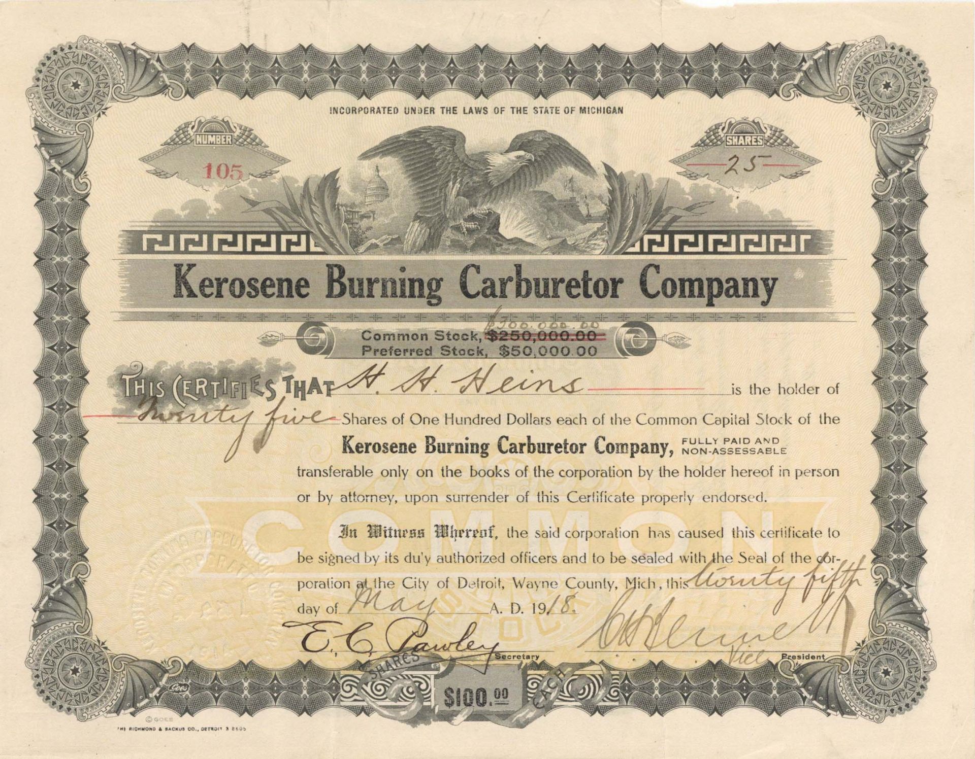 Kerosene Burning Carburetor Co. - 1918 dated Stock Certificate