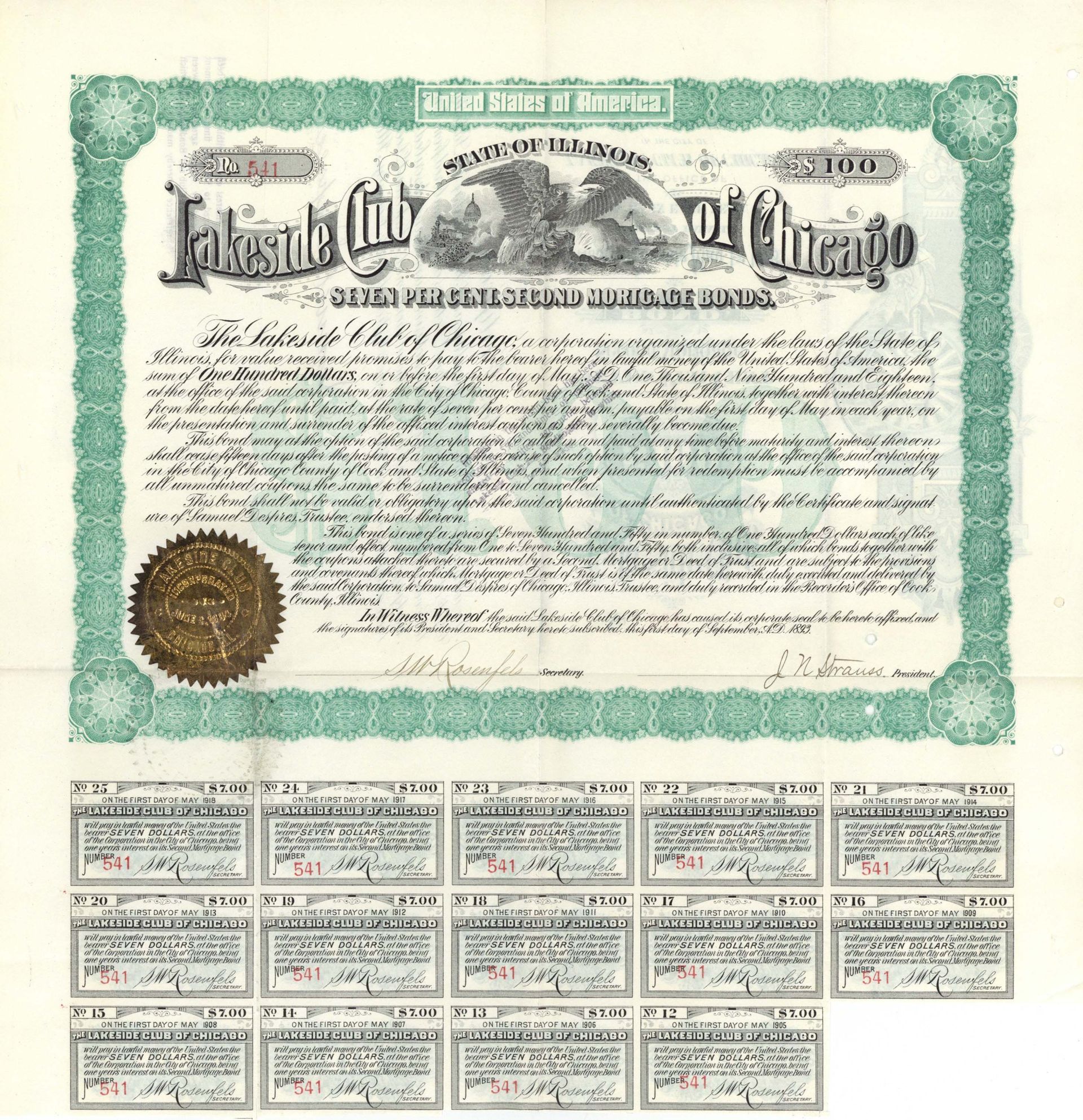 Lakeside Club of Chicago - 1893 dated $100 Bond