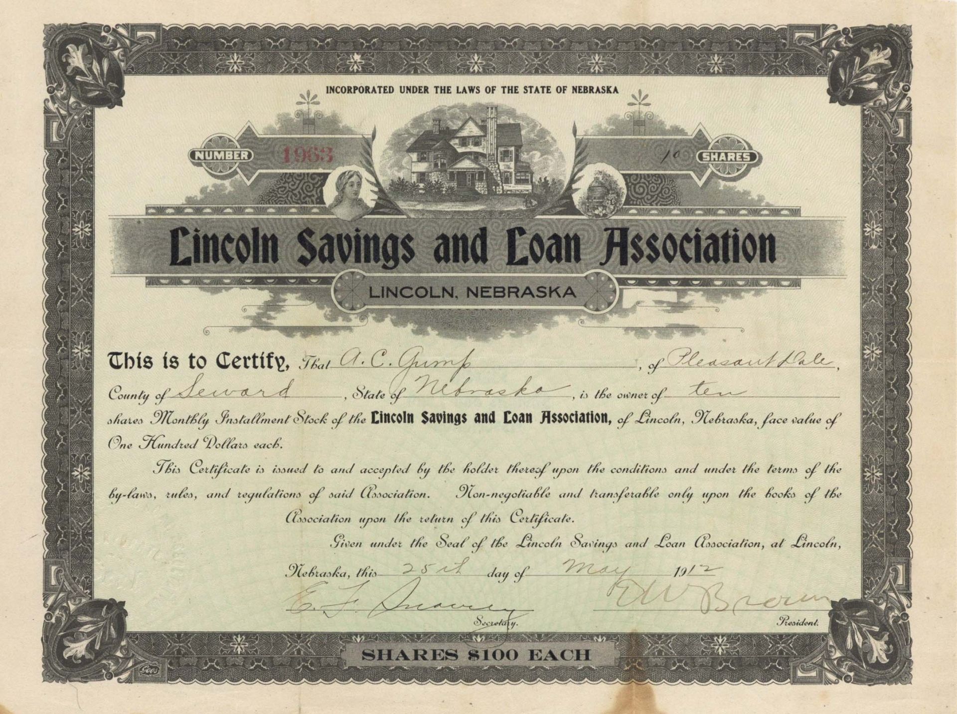 Lincoln Savings and Loan Association - 1912 dated Stock Certificates