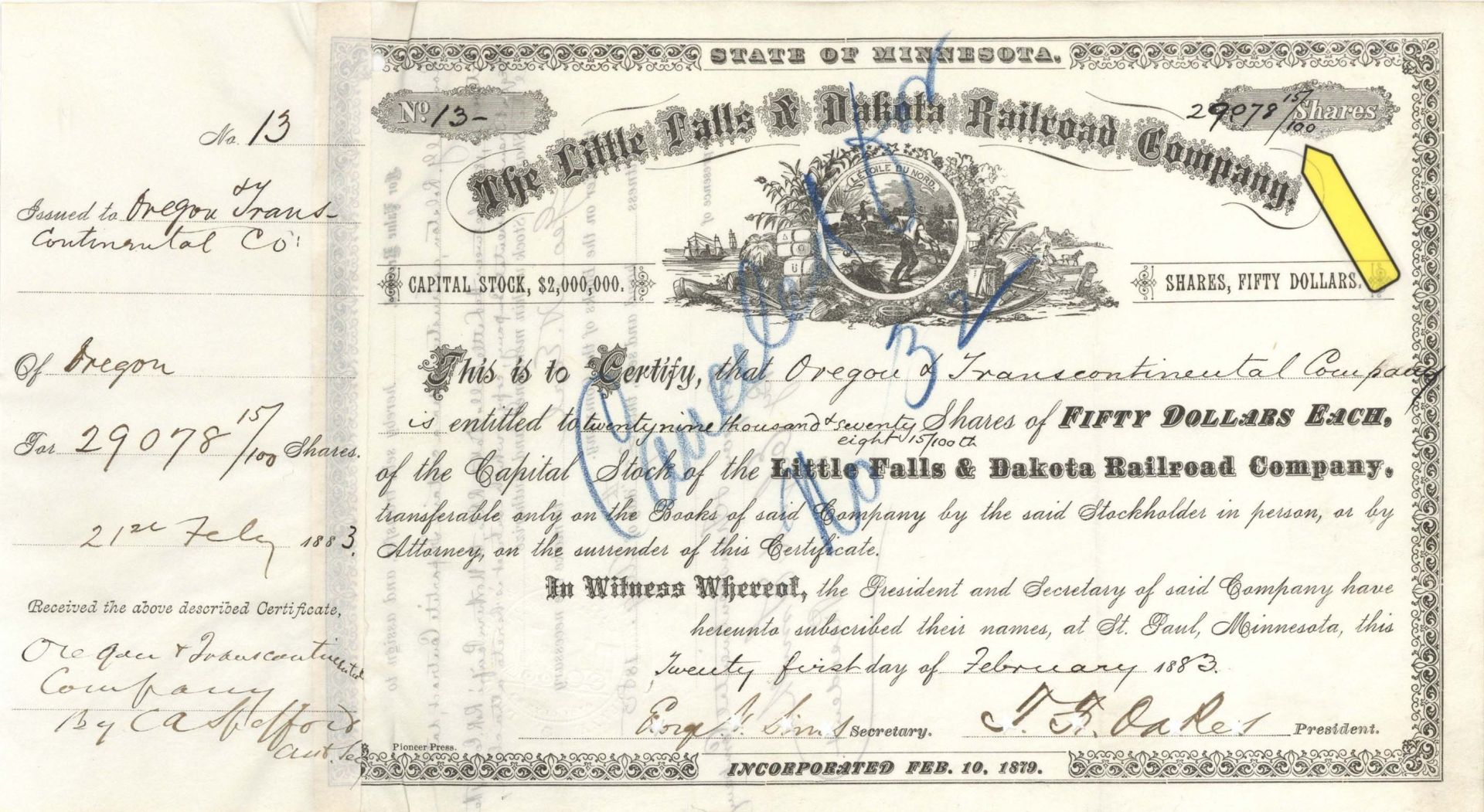 Little Falls and Dakota Railroad Co. - 1883 dated High Denomination Stock Certificate