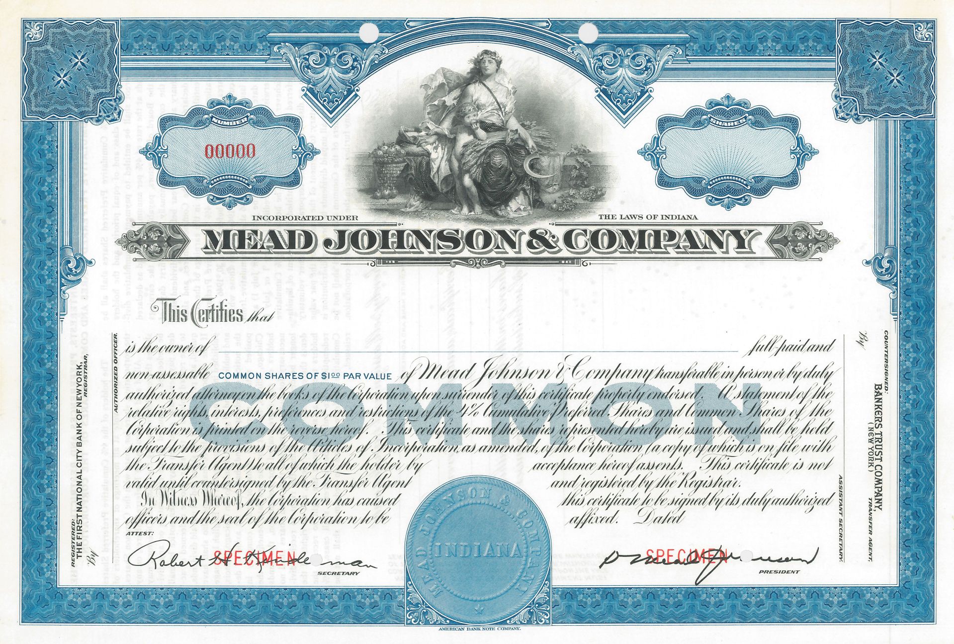 Stock and Bond Specimens are made and usually retained by a printer as a record of the contract with a client, generally with manuscript contract notes such as the quantity printed. Specimens are sometimes produced for use by the printing company's sales team as examples of the firm’s products. These are usually marked "Specimen" and have no serial numbers.