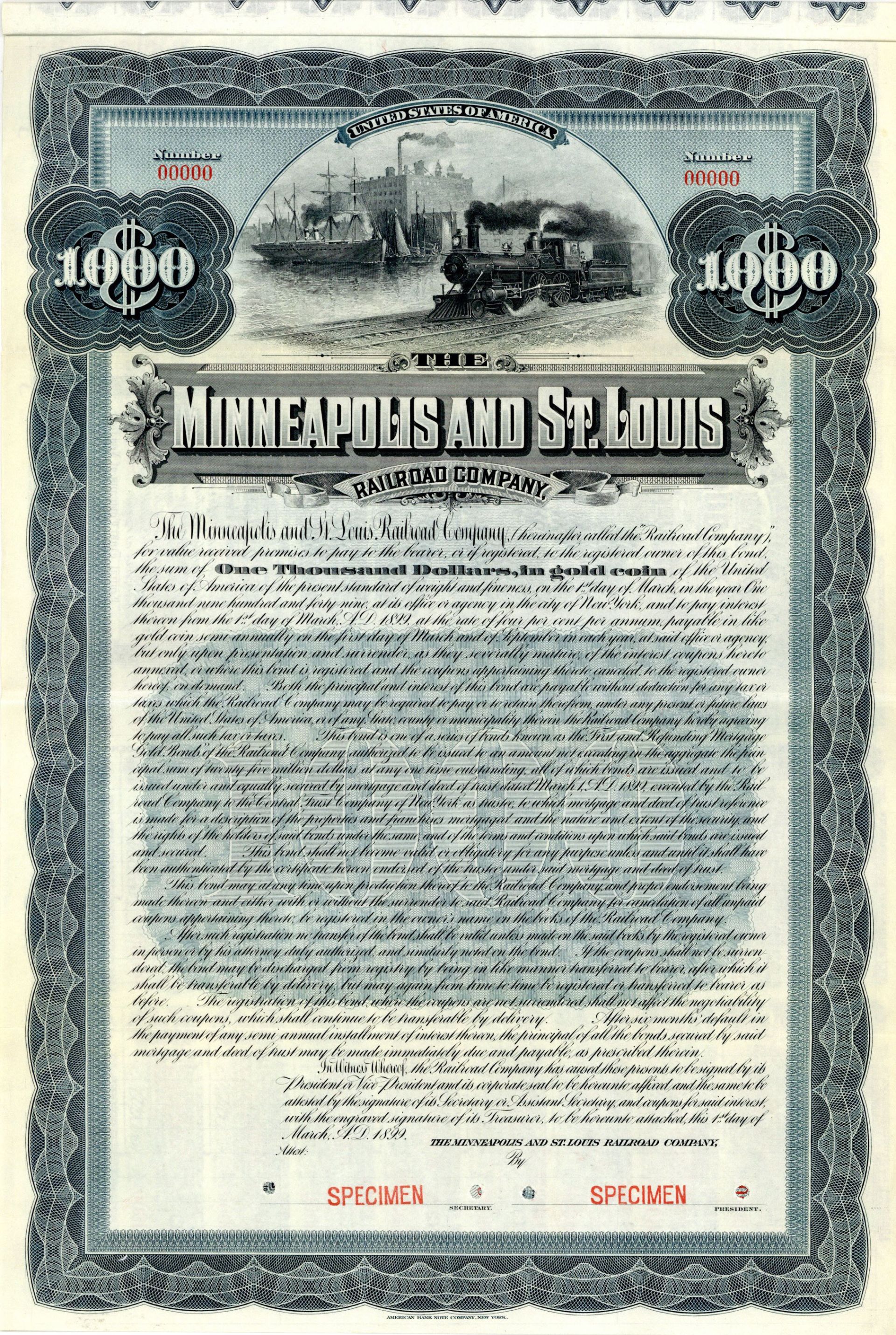 Minneapolis and St. Louis Railroad Co. 1899 dated $1,000 Specimen Bond - Specimen Stocks and Bonds