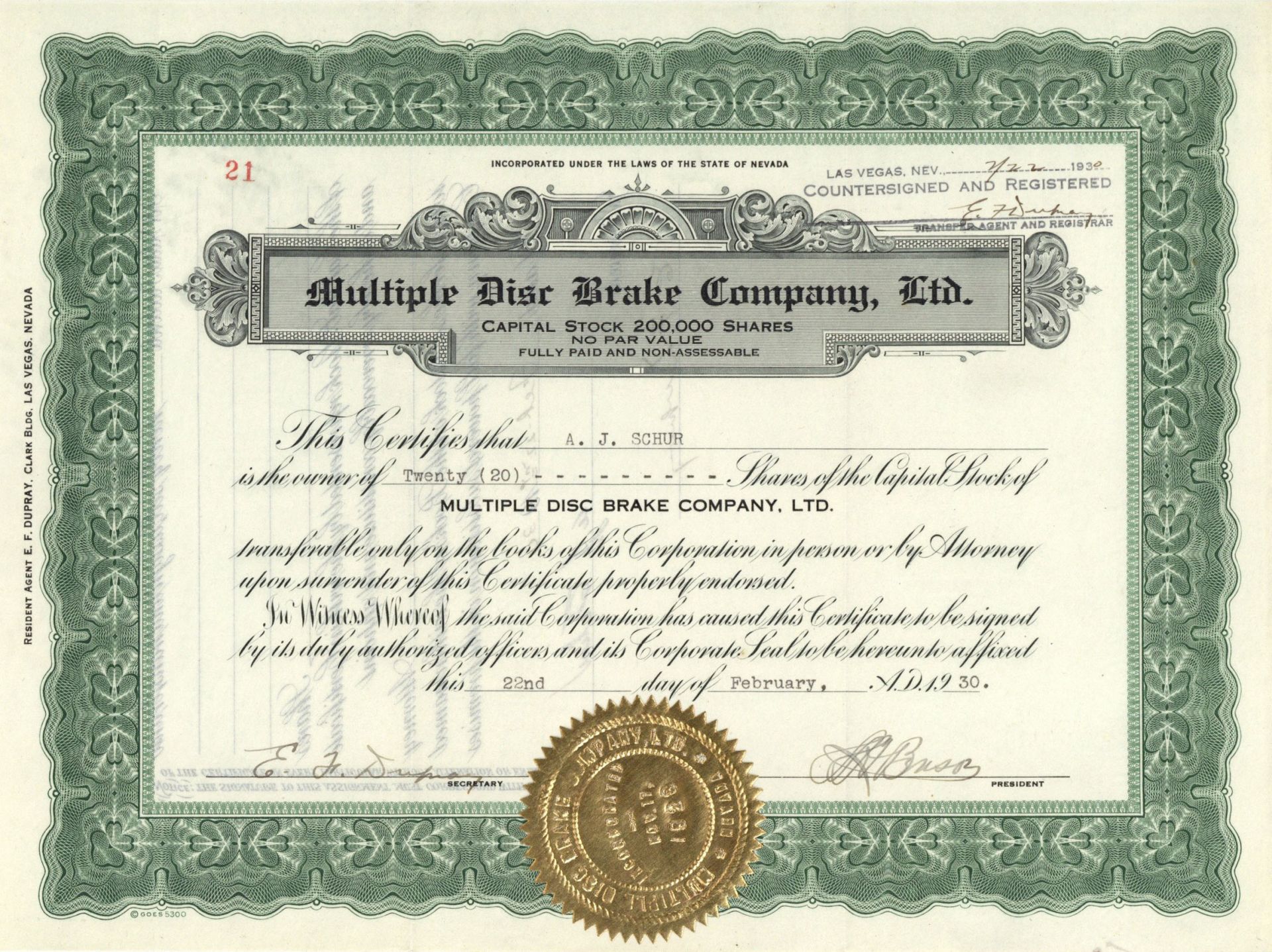 Multiple Disc Brake Co. - 1930 dated Stock Certificate (Uncanceled)