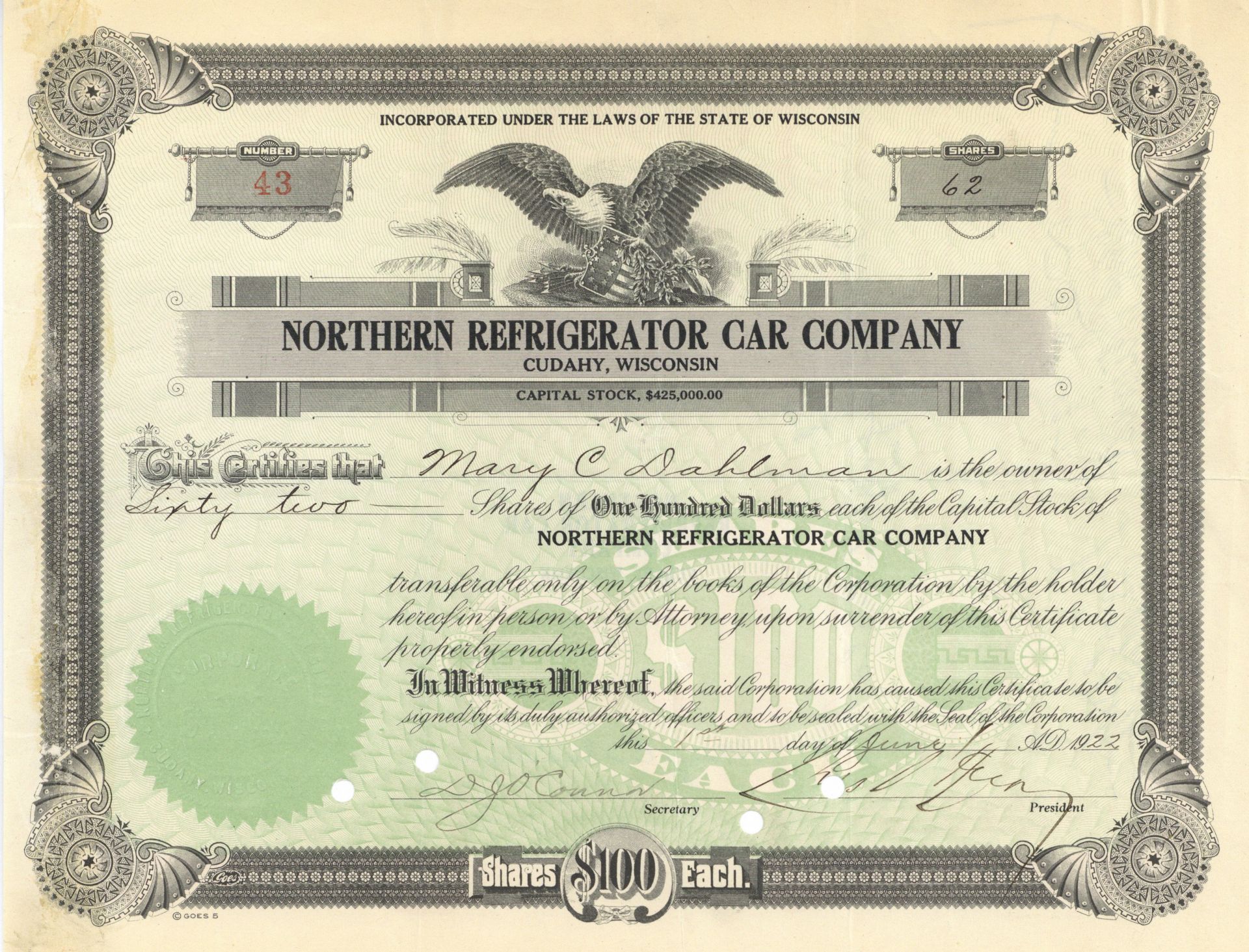 Northern Refrigerator Car Co. - Wisconsin Railway Refrigeration Car Stock Certificate