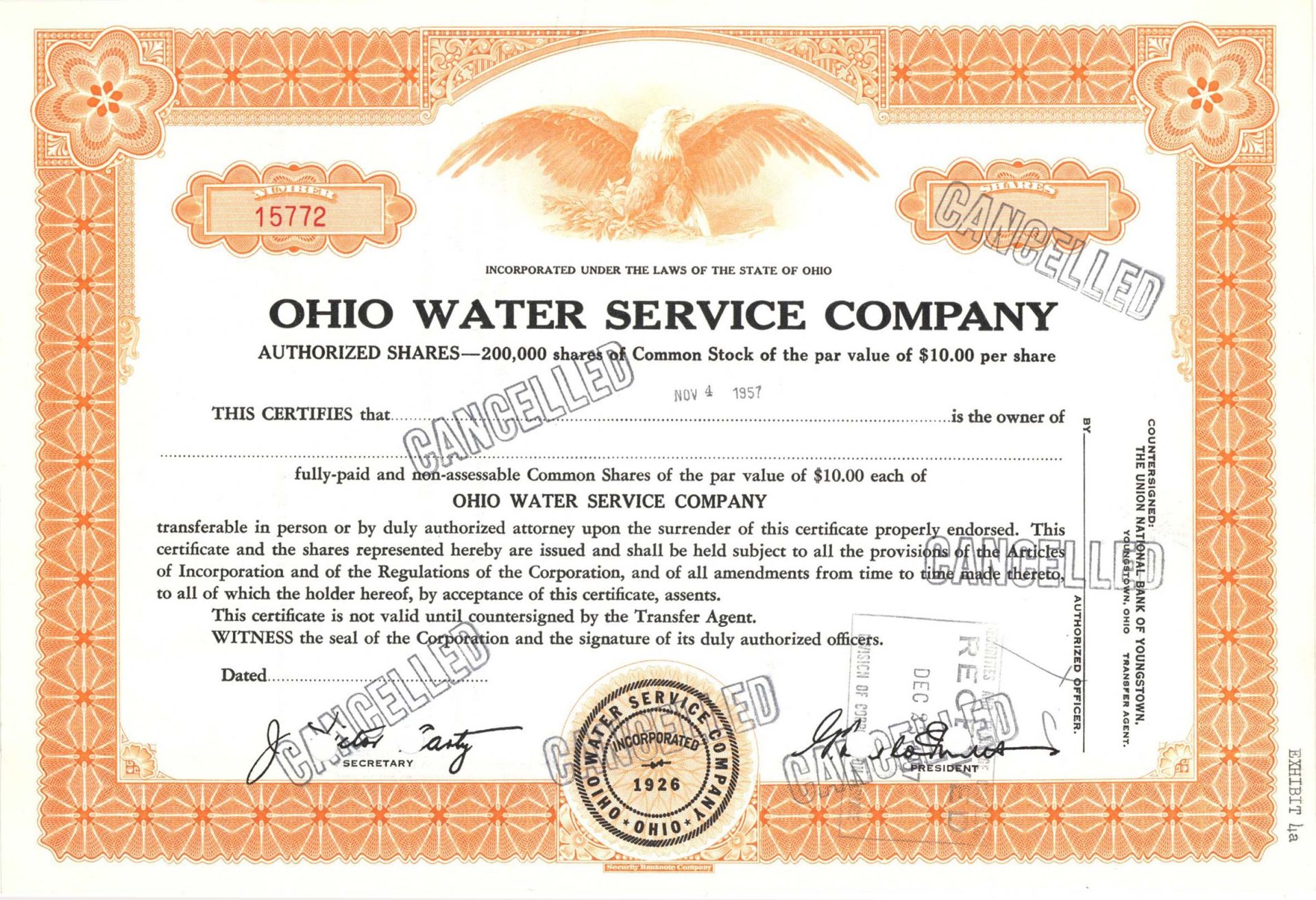 Ohio Water Service Co. - Specimen Stock Certificate