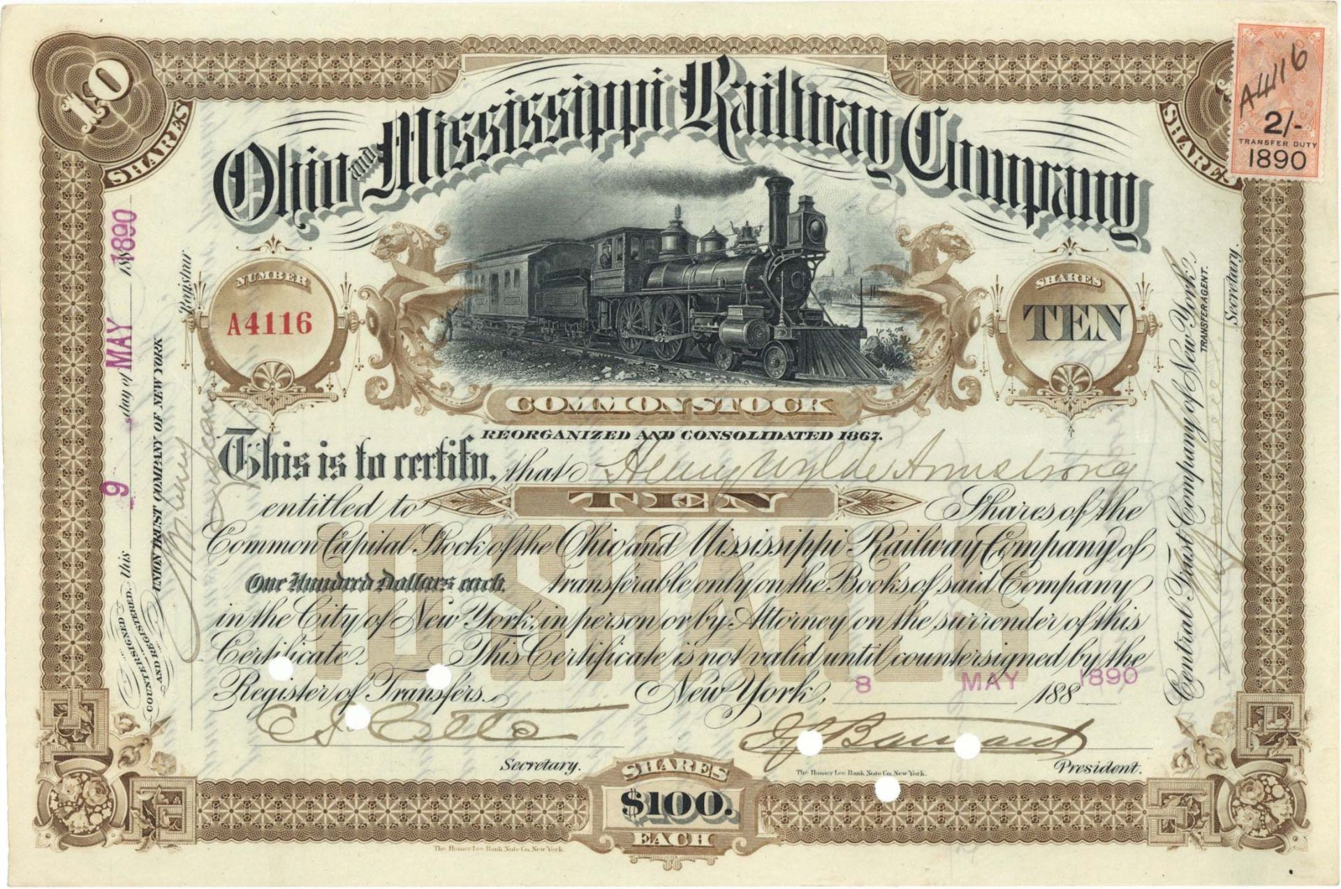 Ohio and Mississippi Railway Co. - 1890 dated Stock Certificate with Revenue Stamp