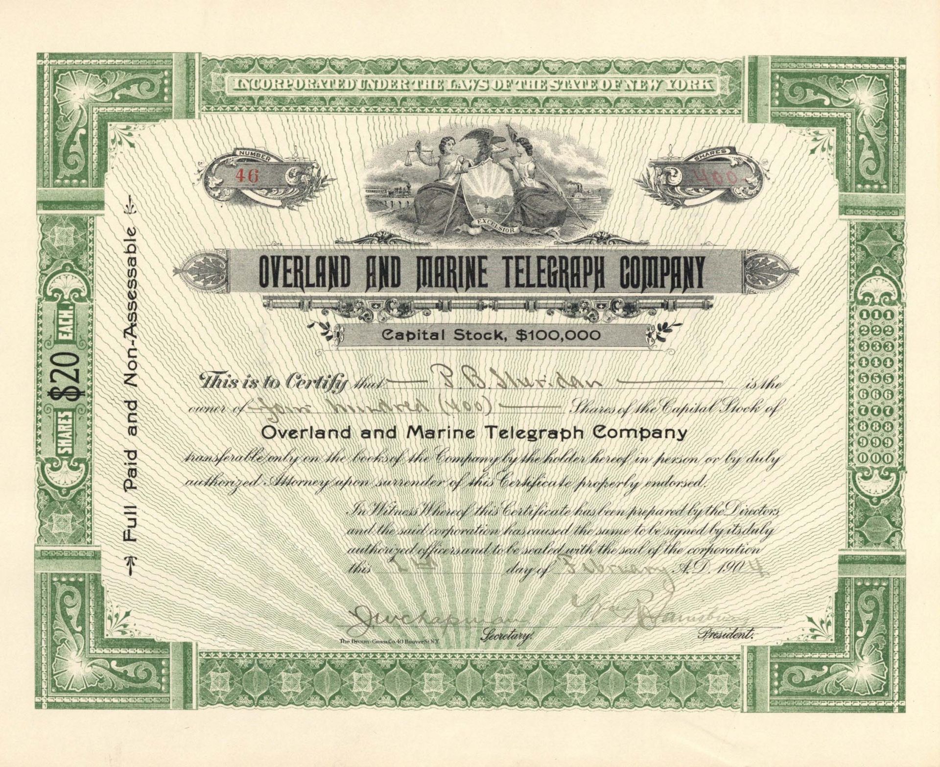 Overland and Marine Telegraph Co. - 1904 dated Stock Certificate