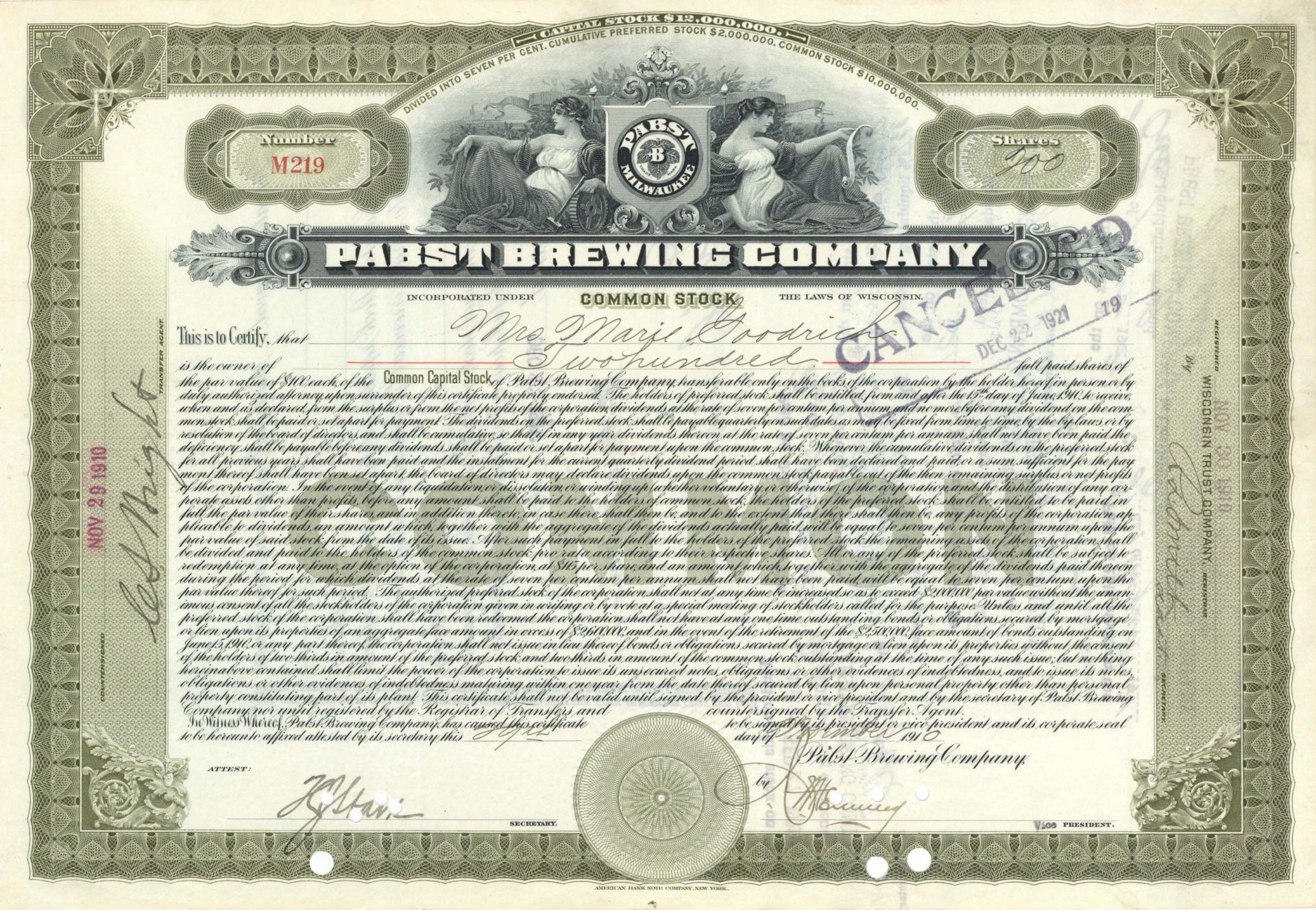 Pabst Brewing Co. - 1910 dated Beer Stock Certificate