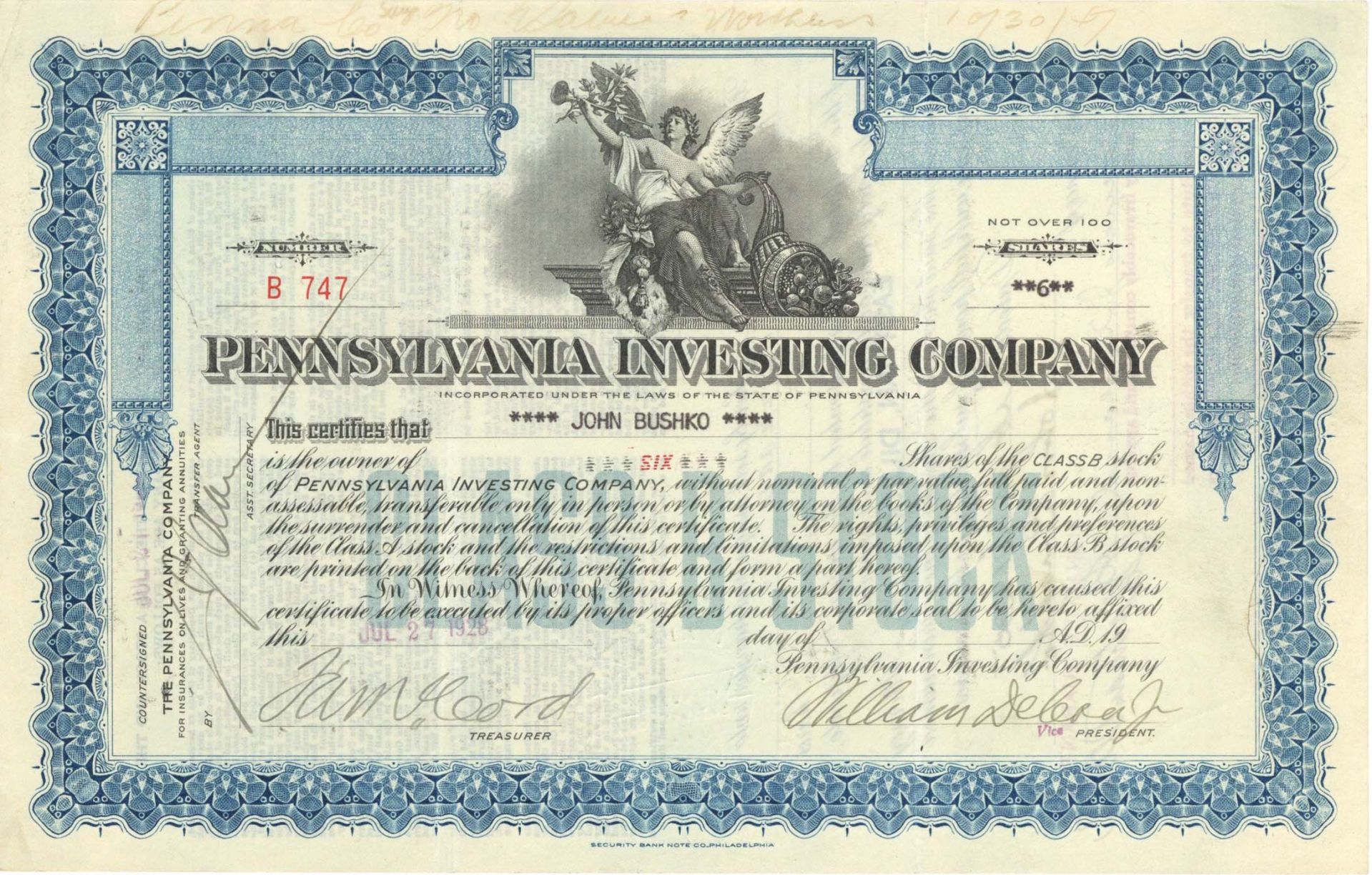 Pennsylvania Investing Co. - 1928 dated Stock Certificate