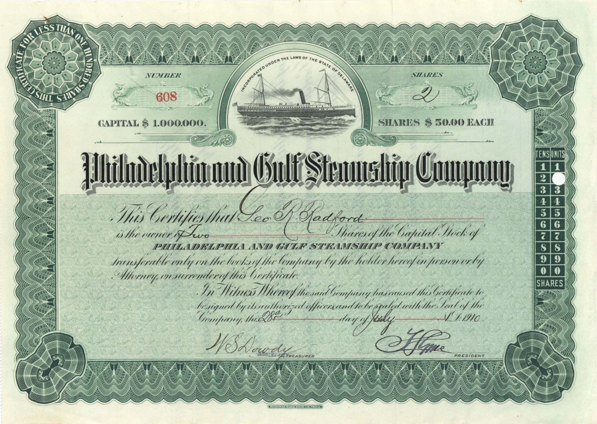 Philadelphia and Gulf Steamship Co. - 1910 dated Stock Certificate