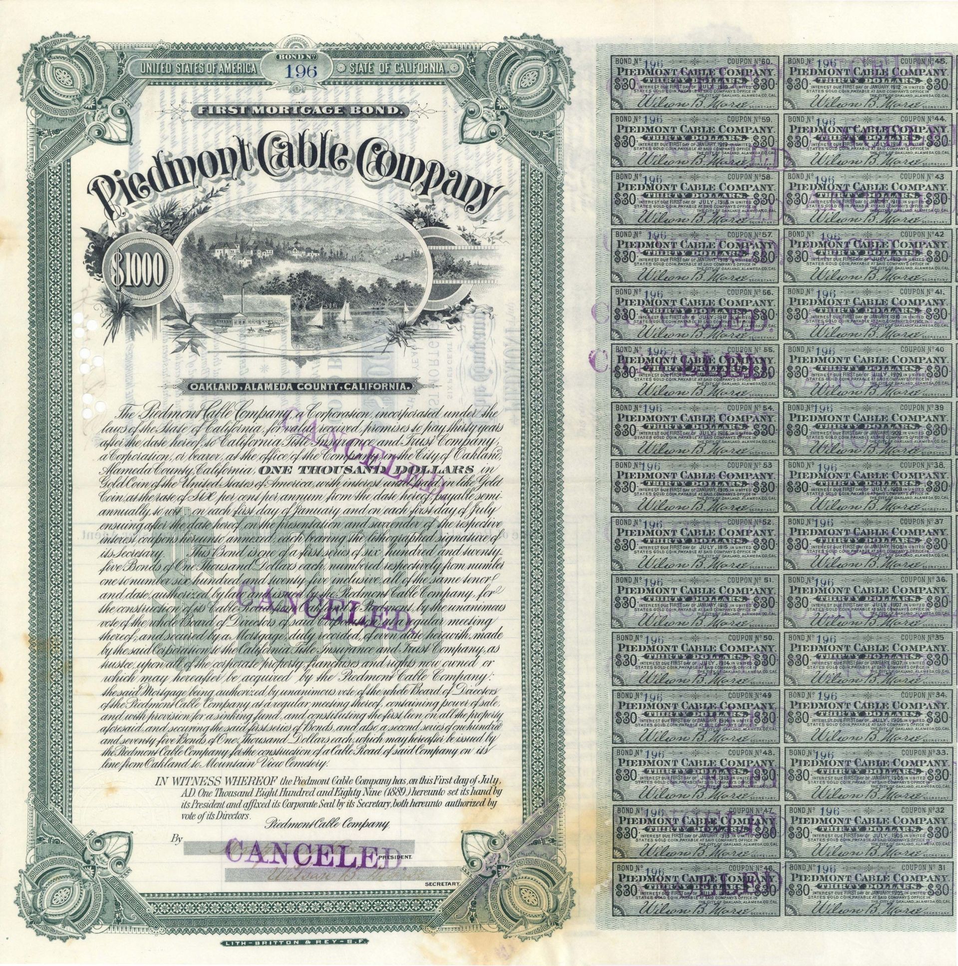 Piedmont Cable Co. - 1889 dated $1,000 Bond