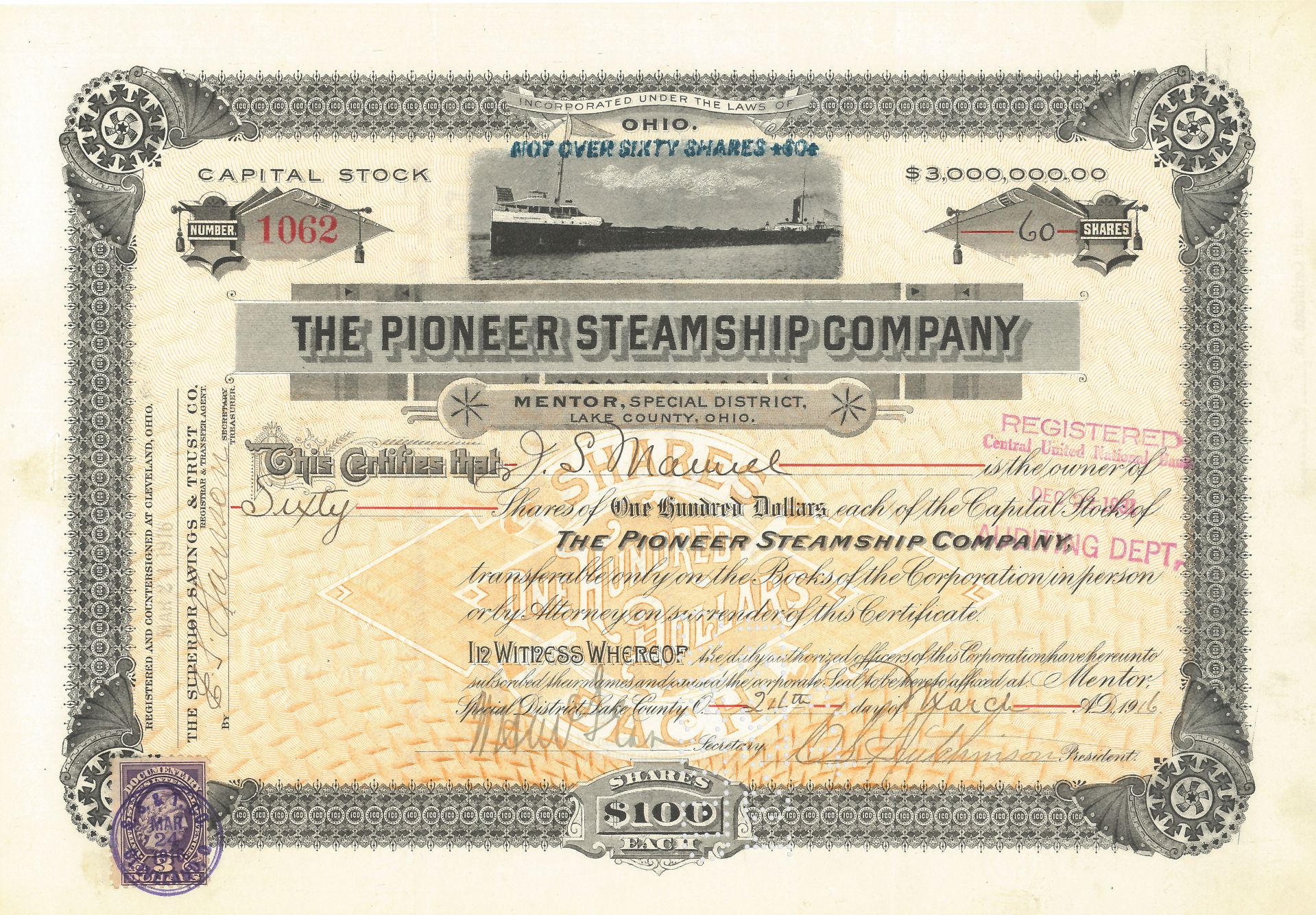 Pioneer Steamship Co. - Stock Certificate