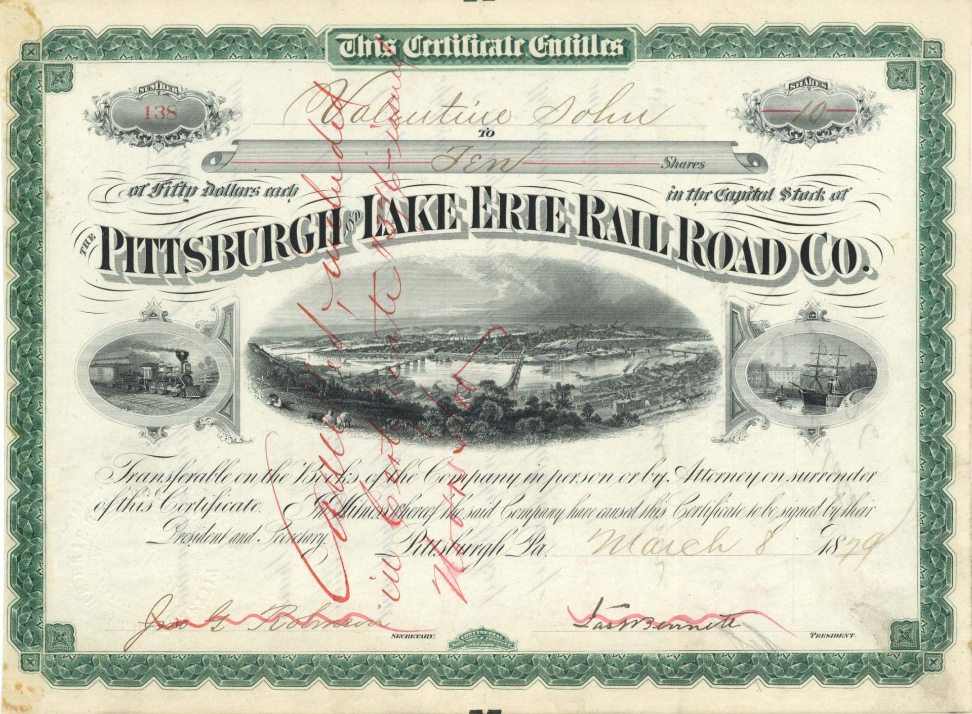 Pittsburgh and Lake Erie Railroad Co. - 1879 dated Railway Stock Certificate
