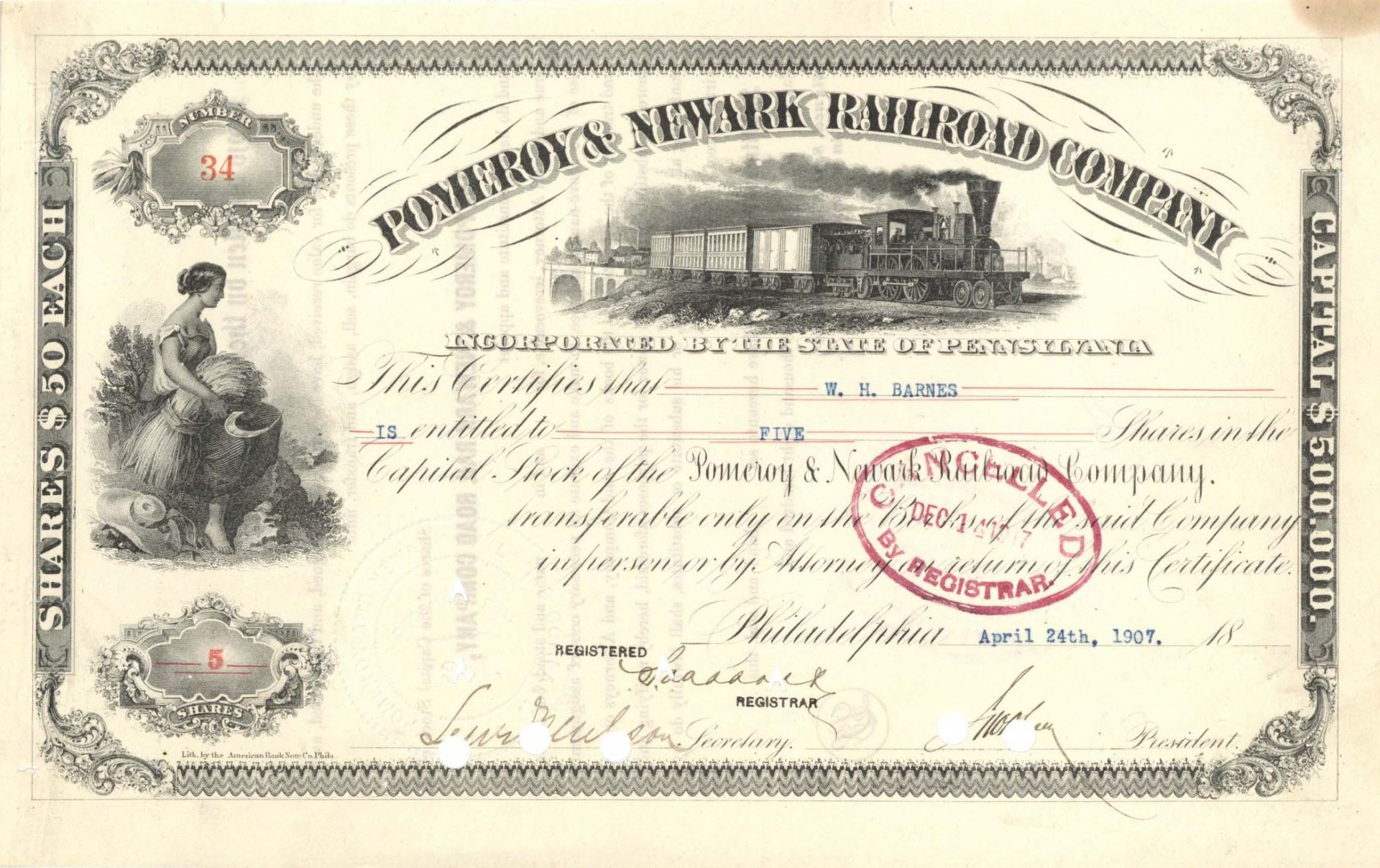 Pomeroy and Newark Railroad Co. - 1907 dated Stock Certificate