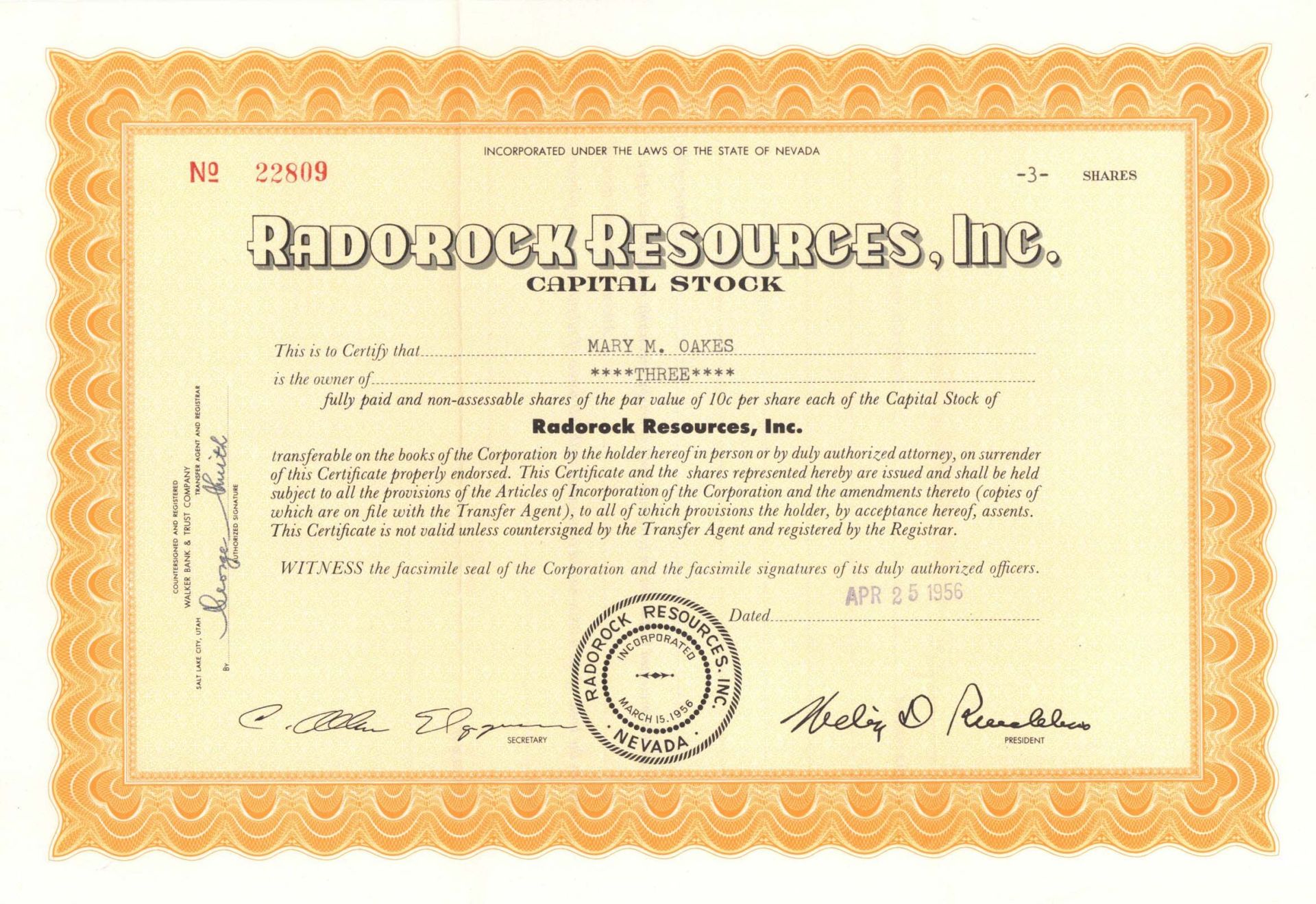 Radorock Resources, Inc. - 1956 dated Stock Certificate