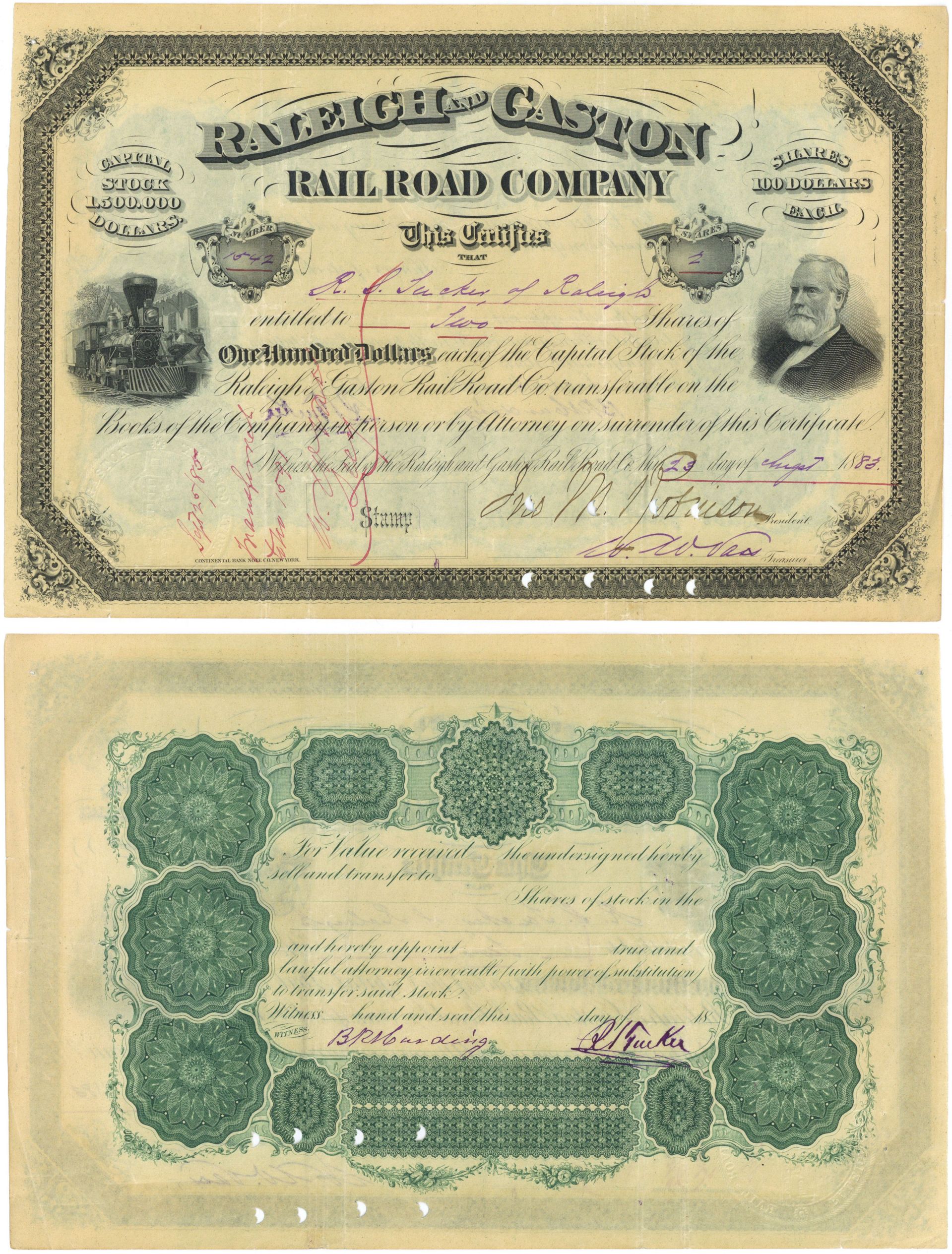 Raleigh and Gaston Railroad - 1867-84 dated North Carolina Railway Stock Certificate - Front and Back Shown