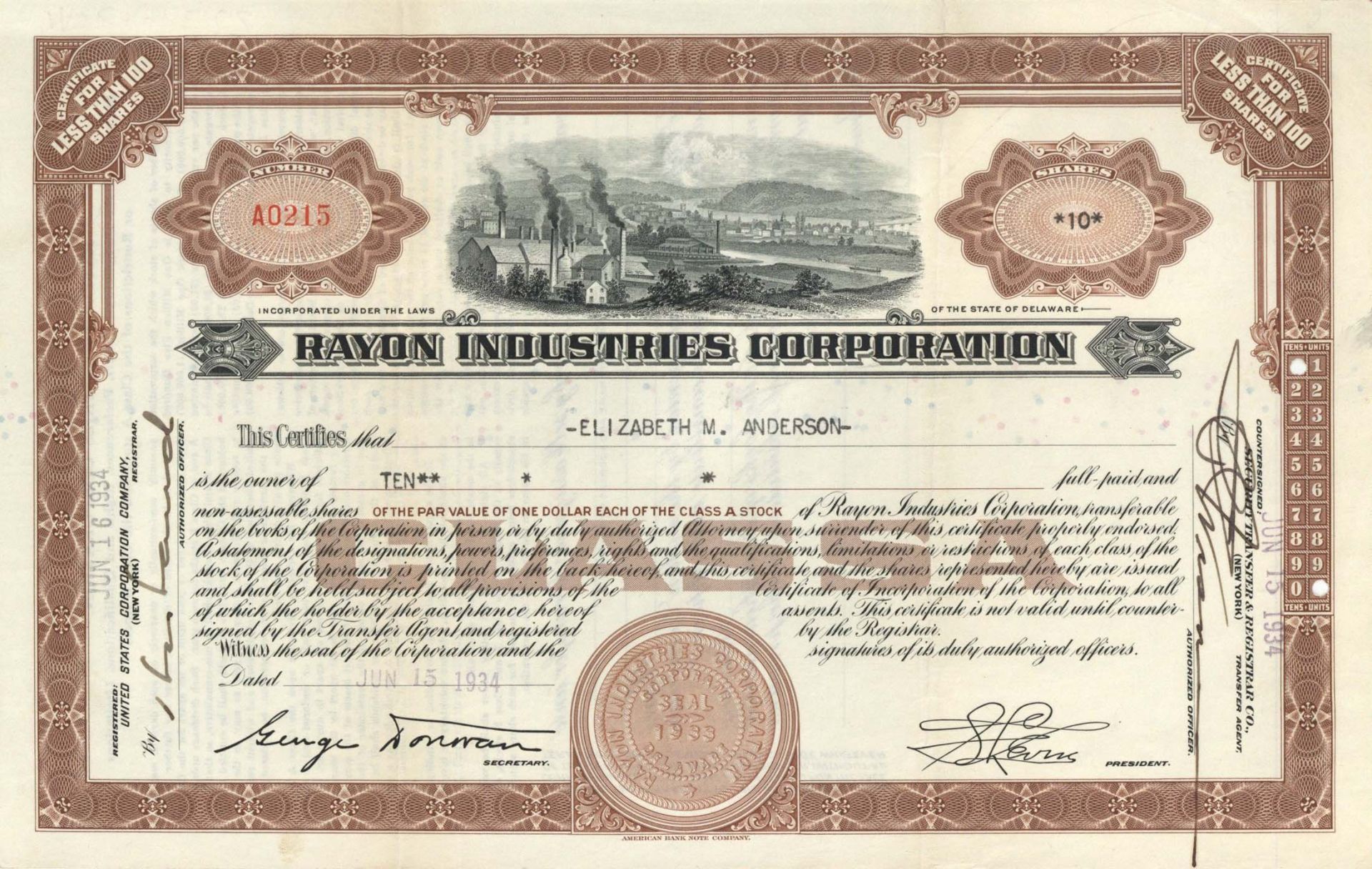 Rayon Industries Corp. - 1934 dated Stock Certificate