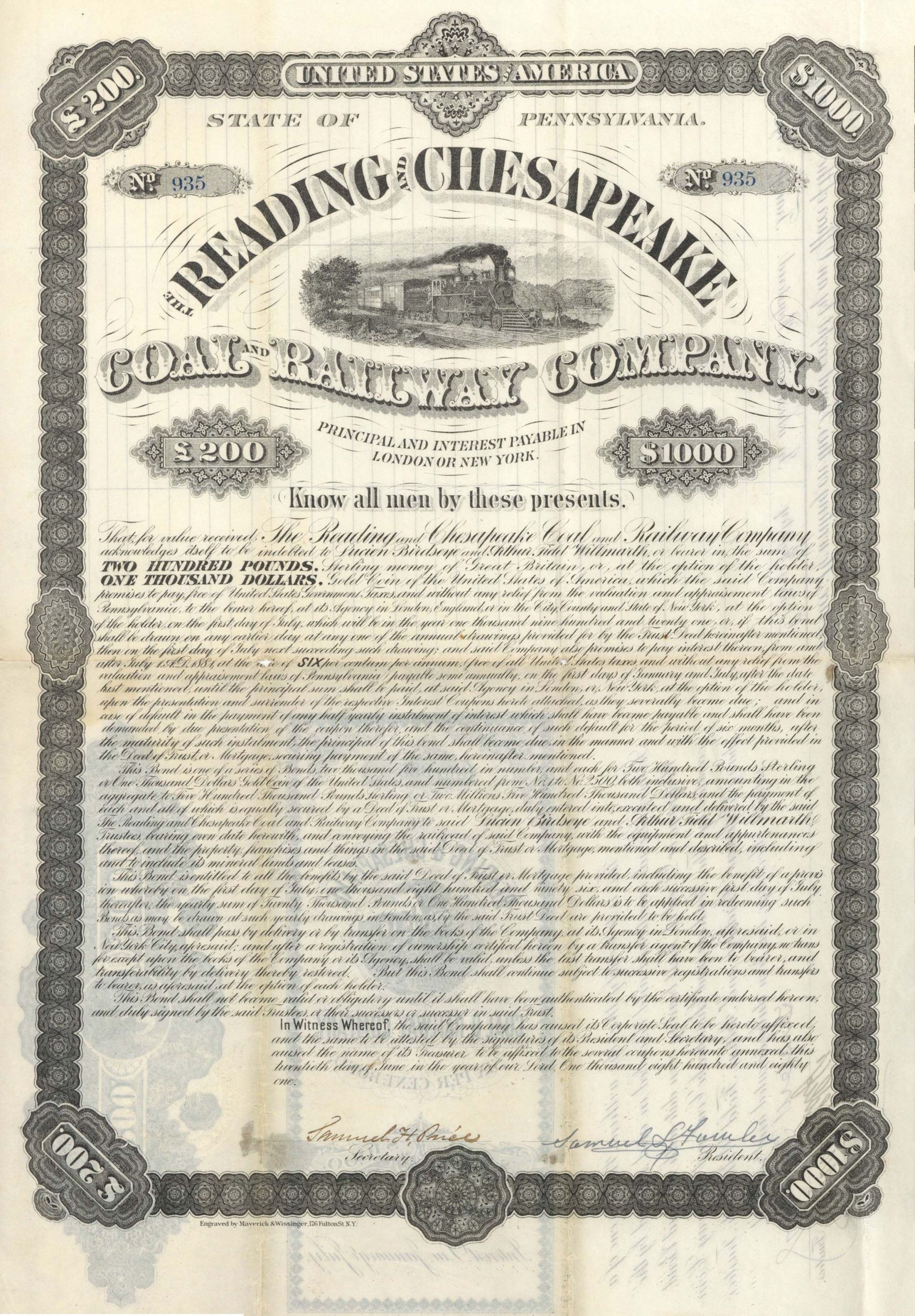 Reading and Chesapeake Coal and Railway Co. - $1,000 Bond