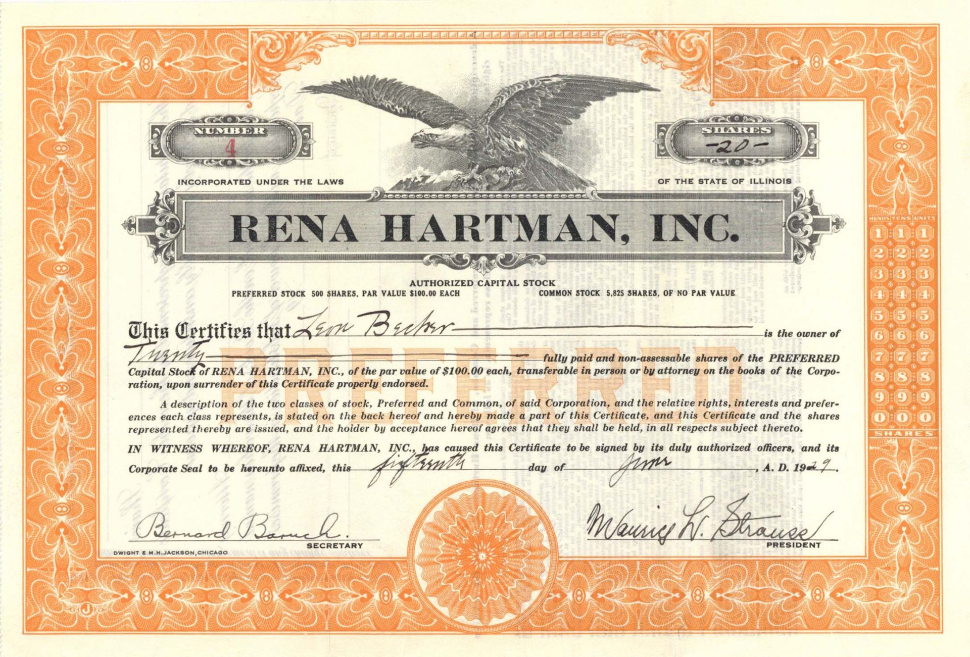 Rena Hartman, Inc. - 1929 dated Stock Certificate