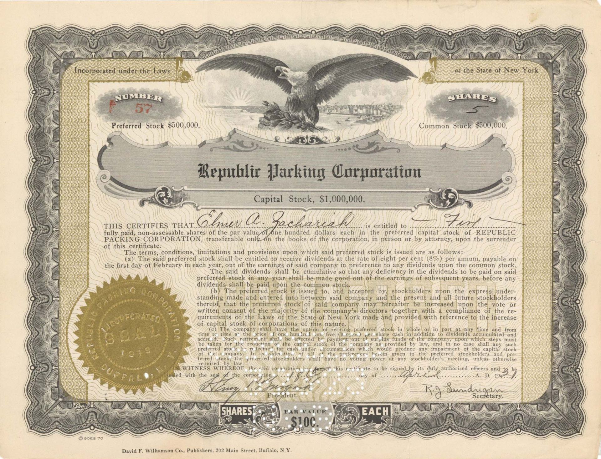 Republic Packing Corp. - 1921 dated Stock Certificate