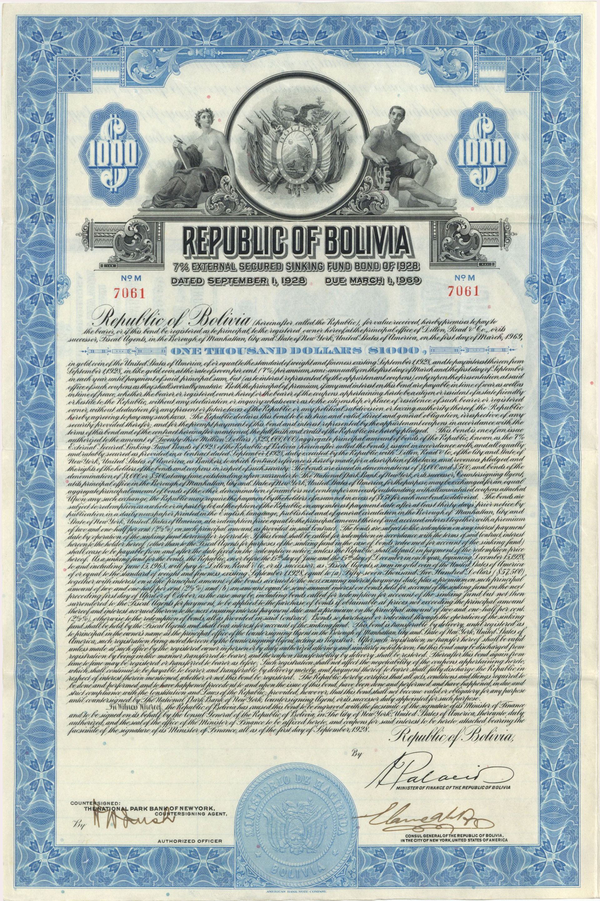 Republic of Bolivia - 1928 dated $1,000 Uncanceled Bond