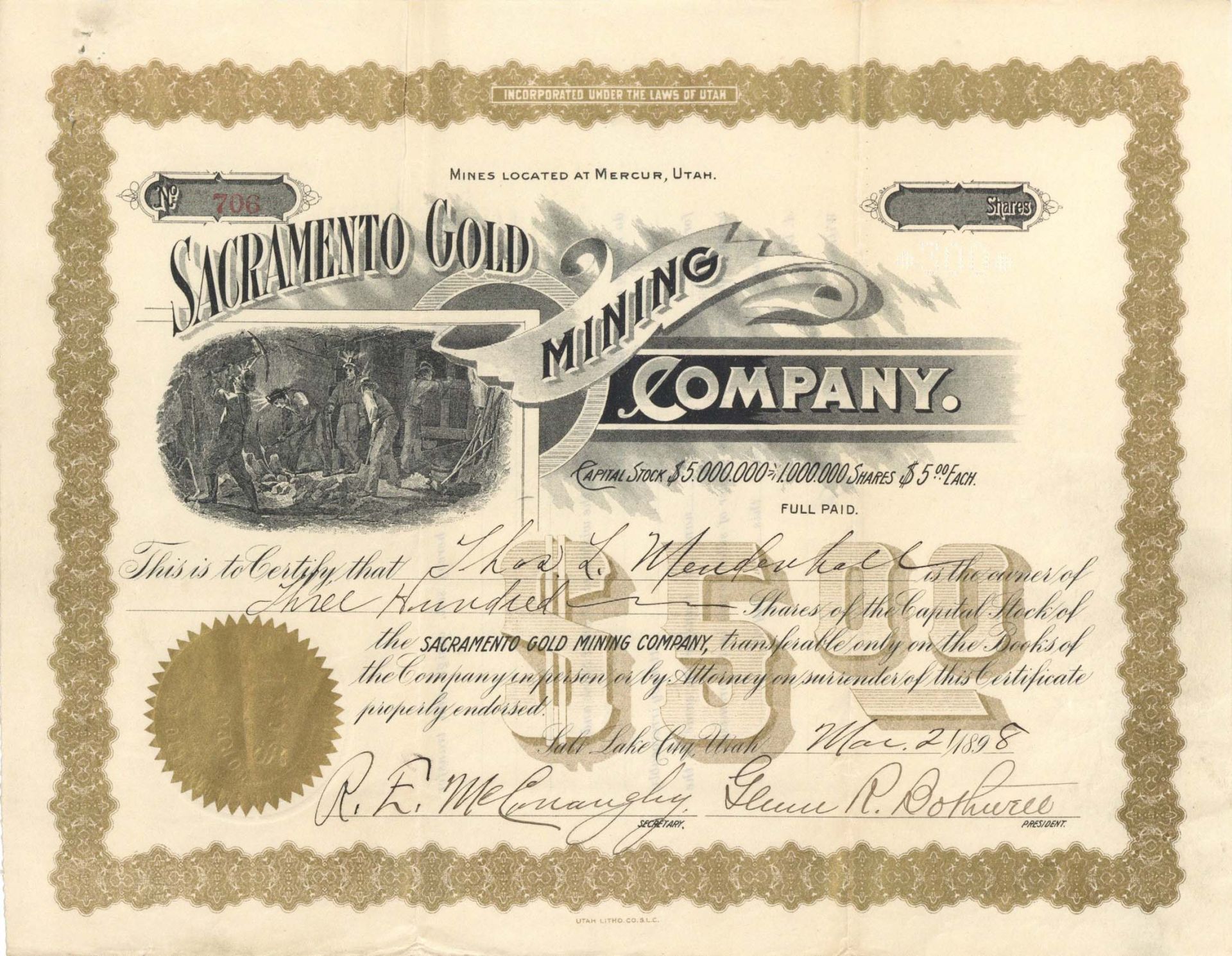 Sacramento Gold Mining Co. - 1898 dated Stock Certificate