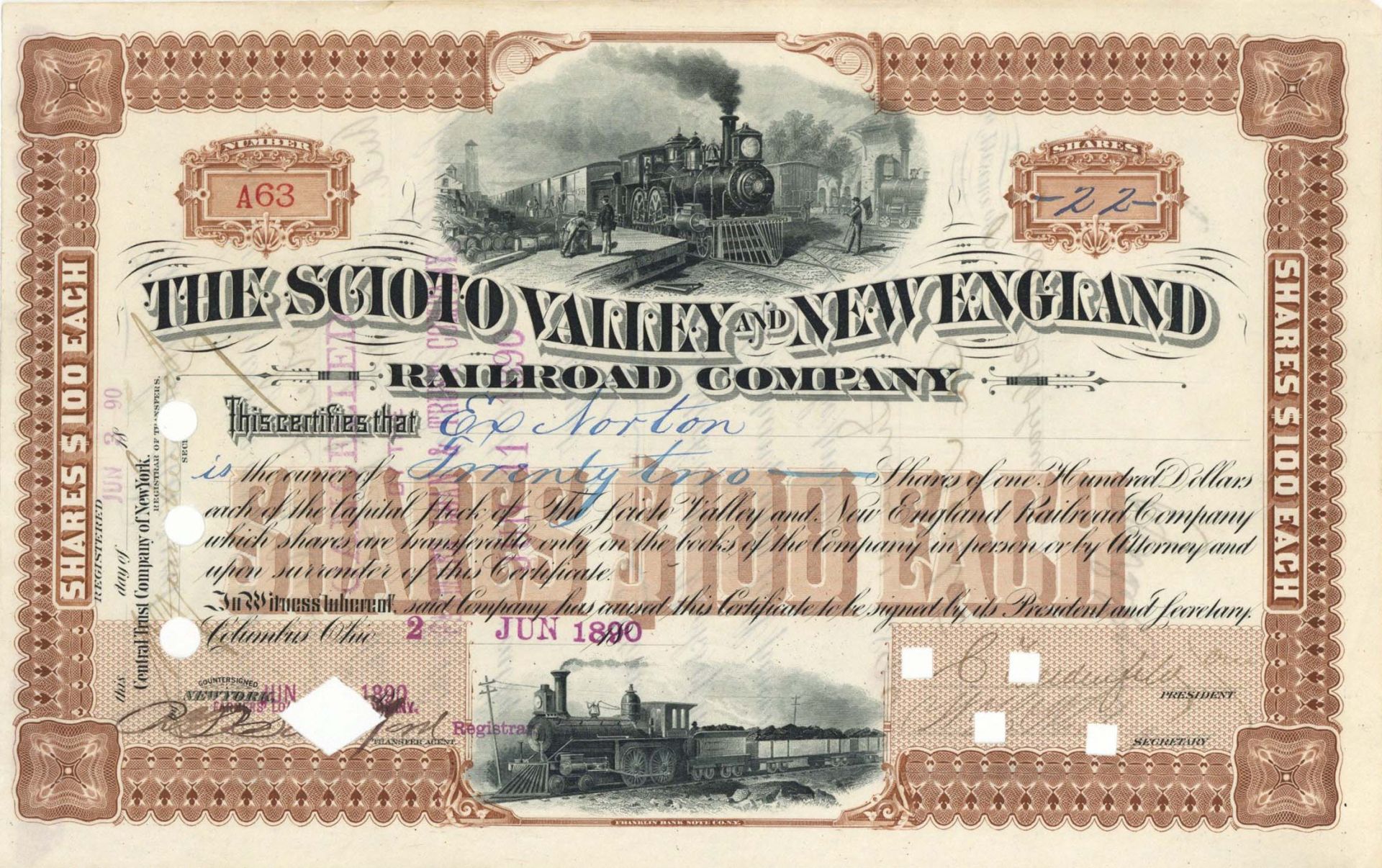 Scioto Valley and New England Railroad Co. - 1890 dated Stock Certificate