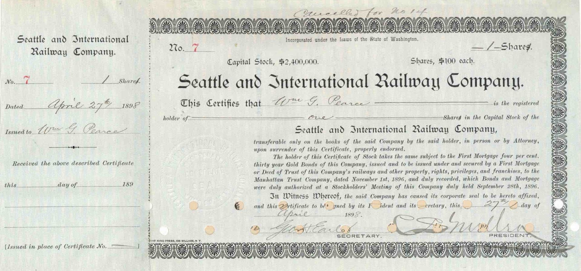 Seattle and International Railway Co. signed by C.S. Mellen and Geo. H. Earl- 1898 dated Autographed Stock Certificate