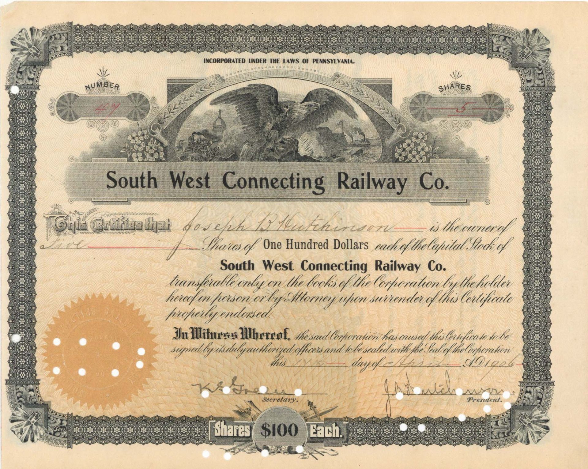 new South West Connecting Railway Co. - 1906 dated Stock Certificate