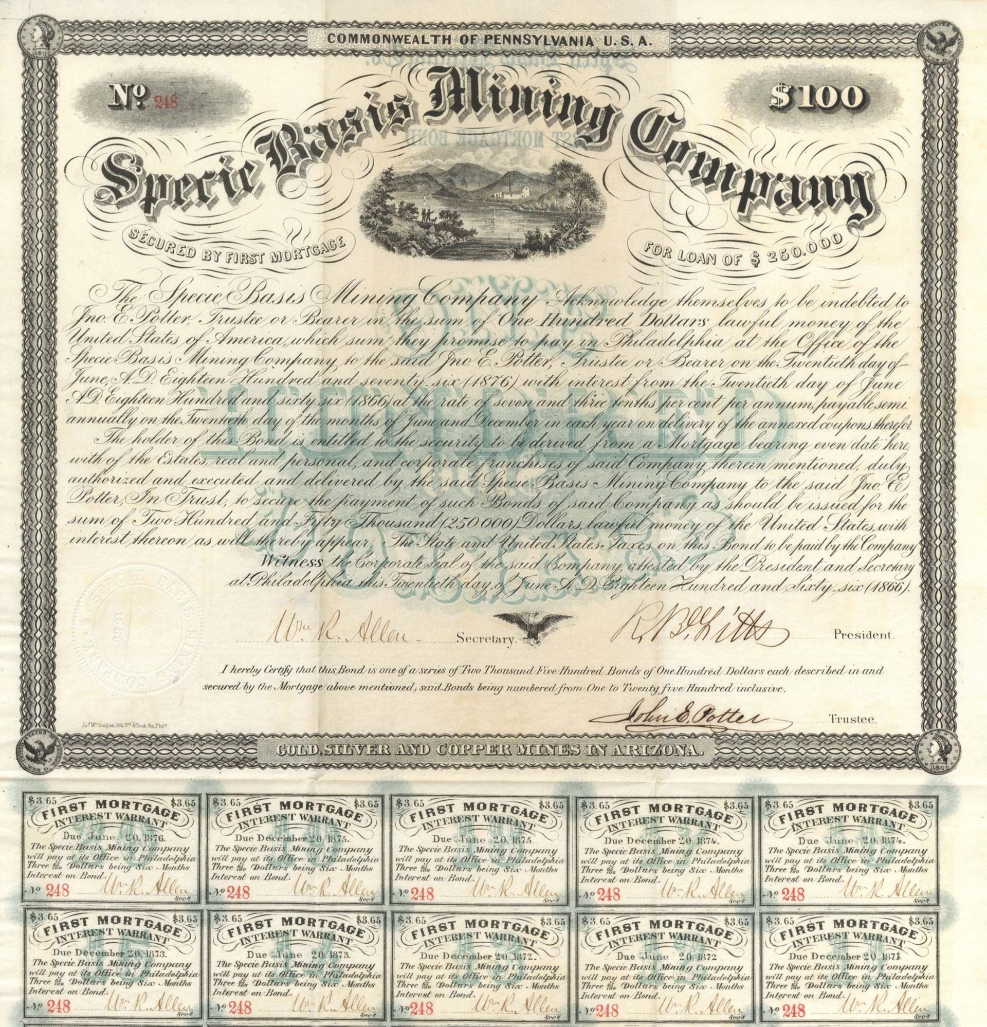 Specie Basis Mining Co. - 1866 dated $100 Mining Bond