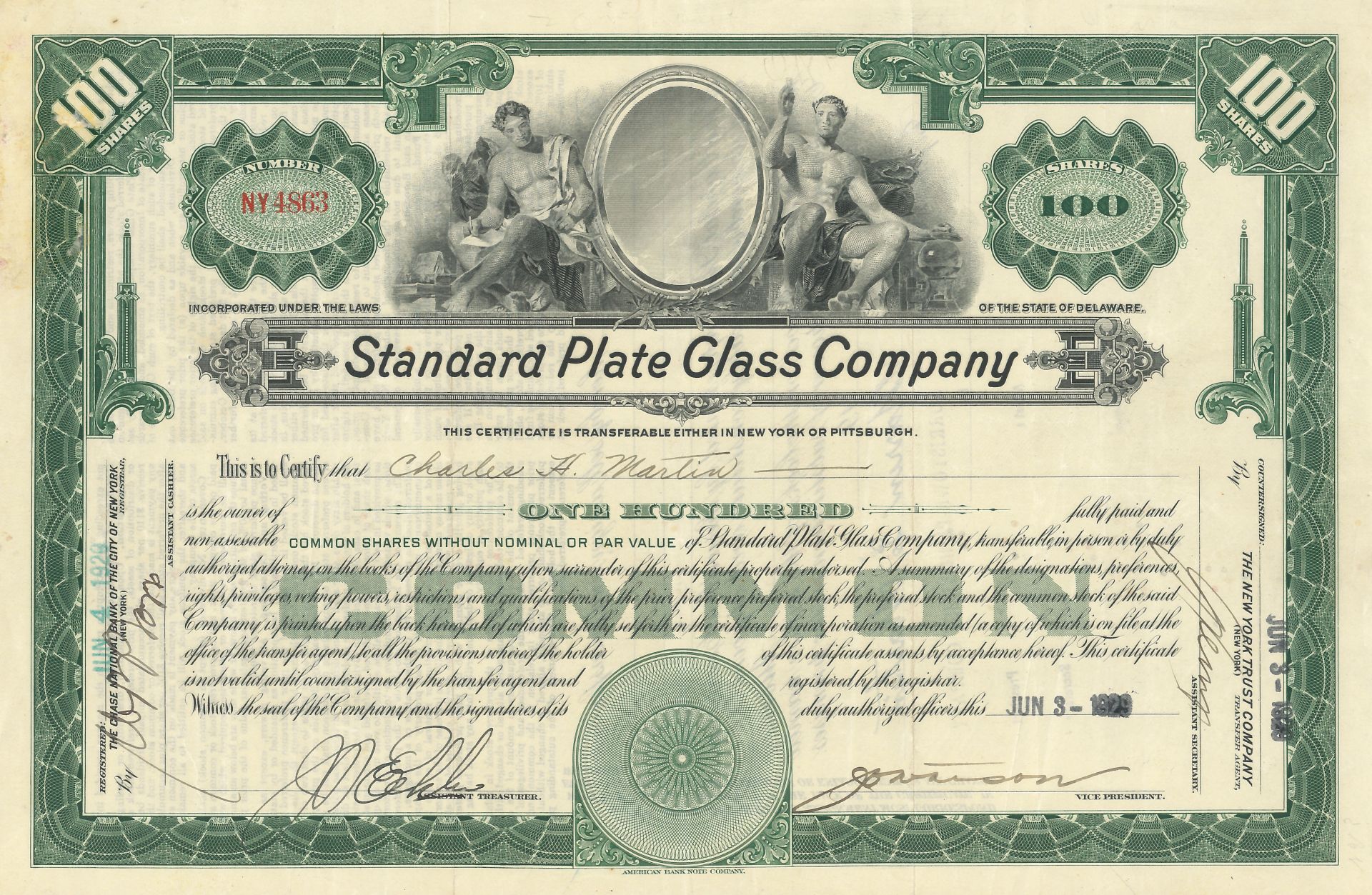 Standard Plate Glass Co. - 1924 or 1927 dated Stock Certificate