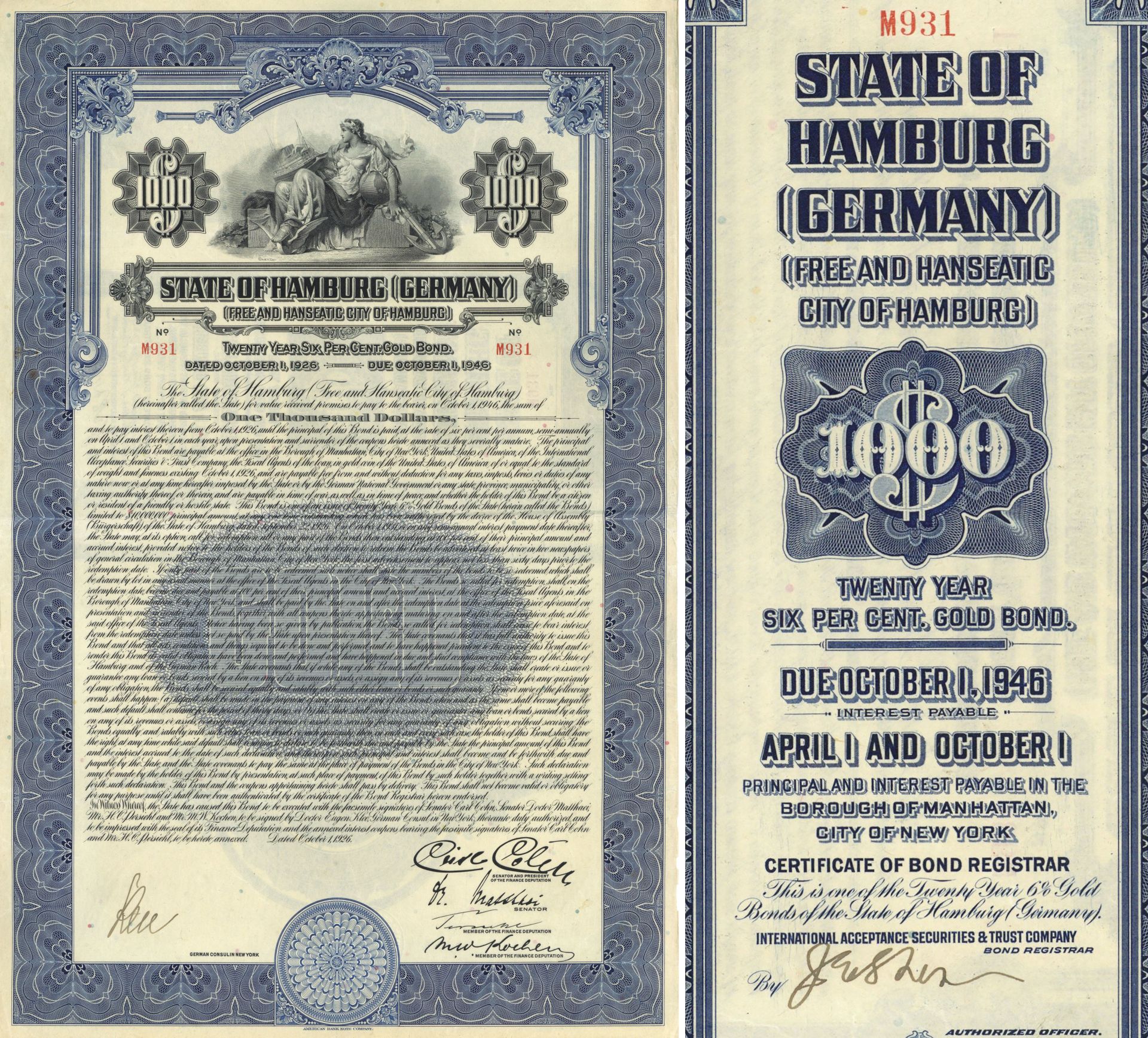 State of Hamburg Germany - 6% 1926 dated $1,000 German Gold Bond - Uncanceled - Hamburg, Germany