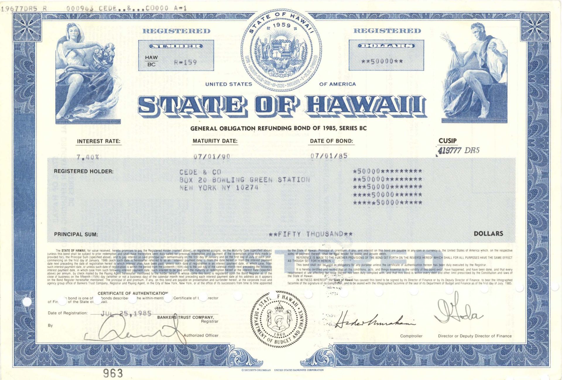 $50,000 7.40% Refunding Bond printed by Security-Columbian United States Banknote Corporation. Incorporated in 1960.