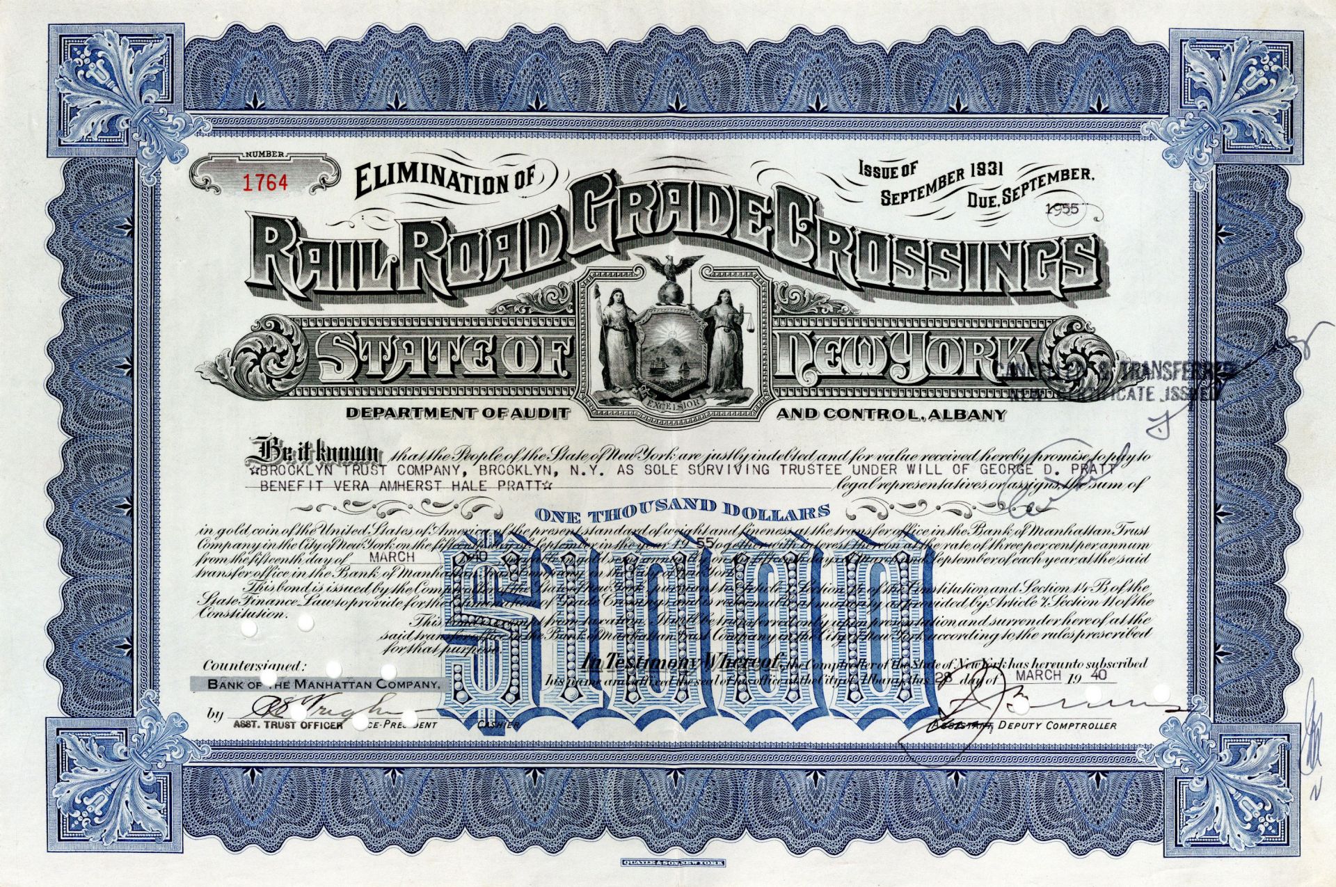 State of New York Elimination of Railroad Grade Crossings - dated 1940's-50's Railway Bond - Various Denominations