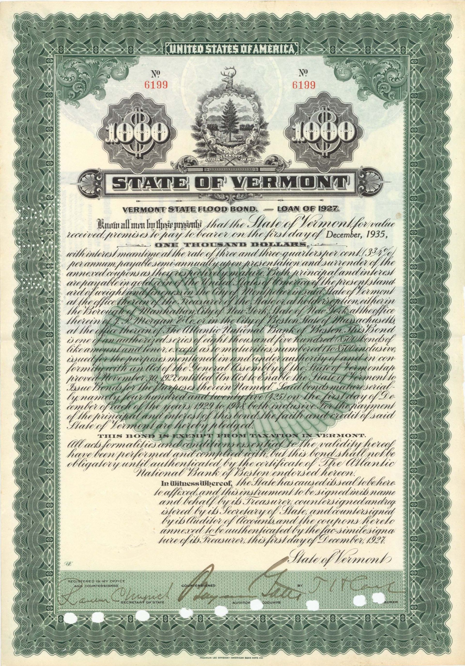 State of Vermont - $1,000 1927 dated Bond