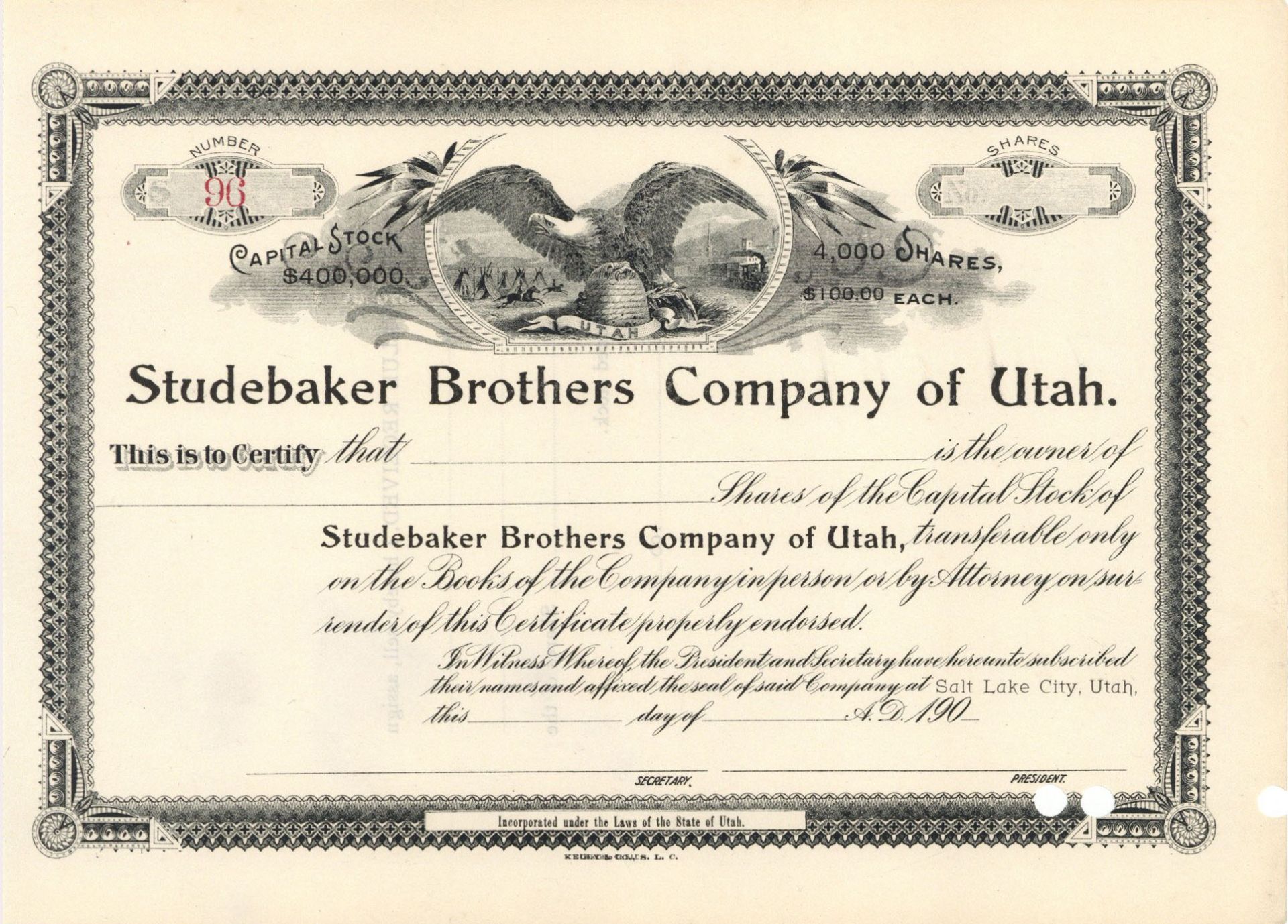Studebaker Brothers Co. of Utah - Unissued Stock Certificate