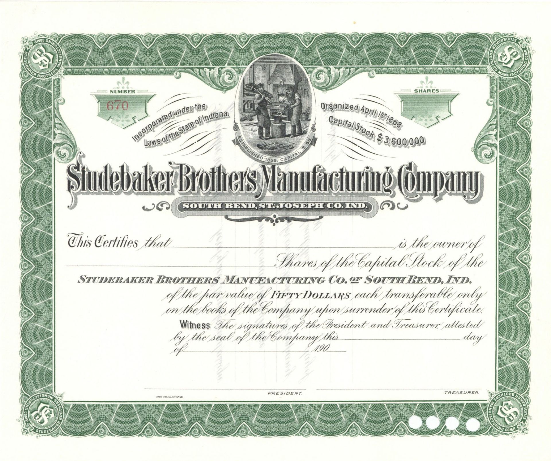 Studebaker Brothers Manufacturing Co. of South Bend, Indiana - Unissued Stock Certificate