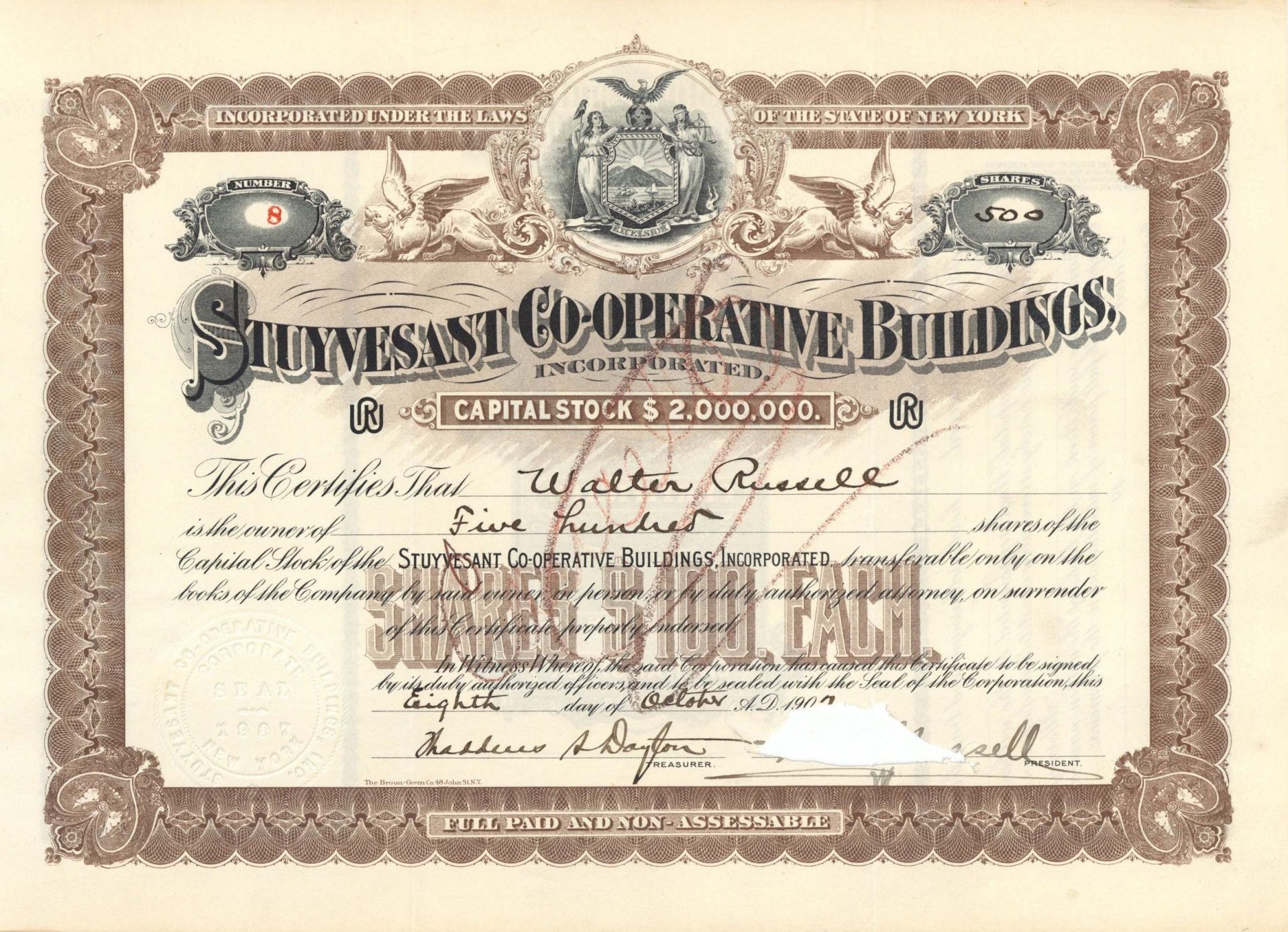 Stock printed by Broun-Green Co., N.Y. Certificate #8 for 500 shares!