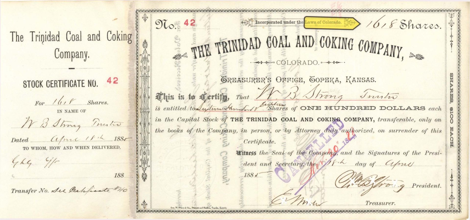 Trinidad Coal and Coking Co. - 1885 dated High Denomination Stock Certificate