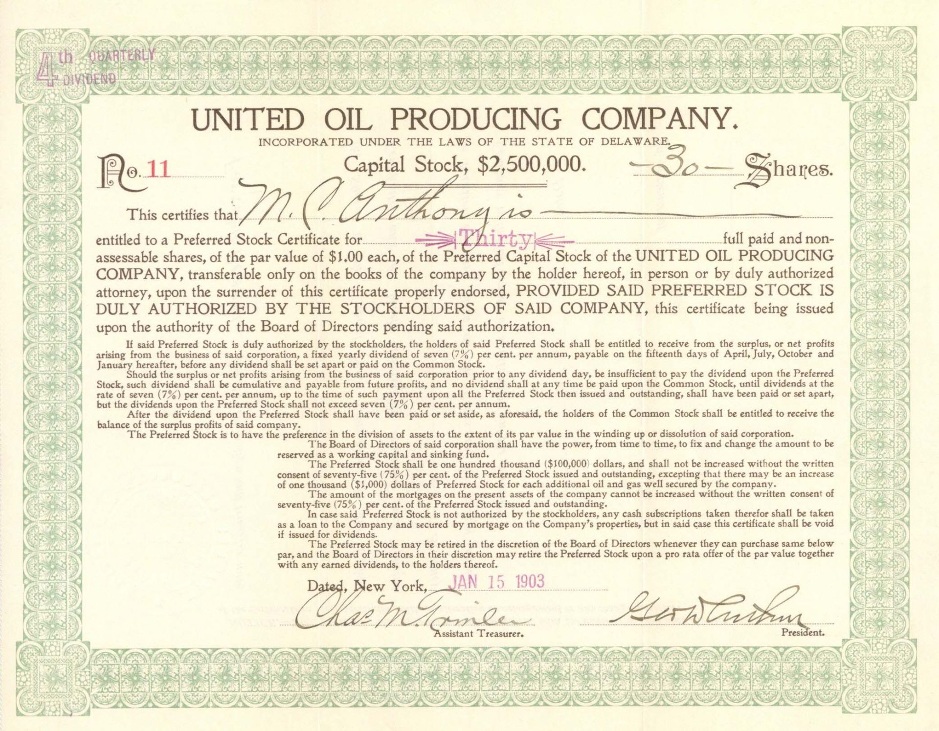 United Oil Producing Company - 1903 dated Stock Certificate