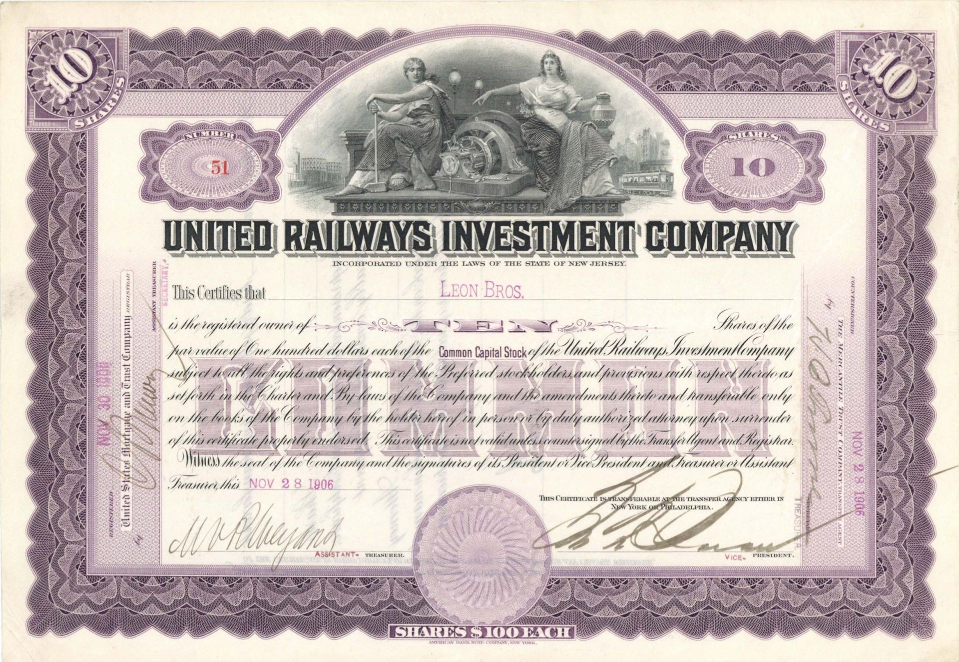 United Railways Investment Co. - 1906 dated Stock Certificate