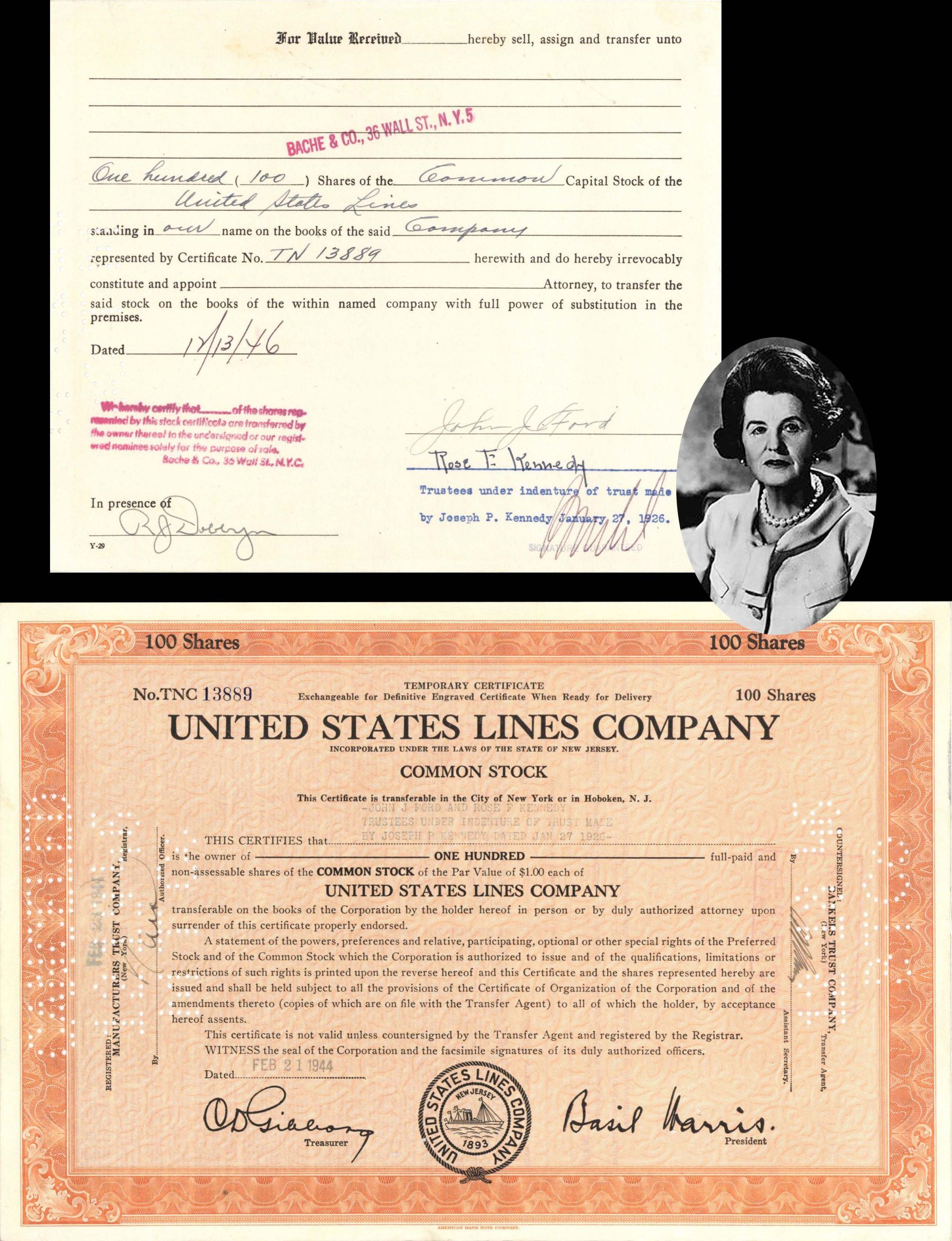 United States Lines Co. signed by Rose F. Kennedy for Trust of Joseph P. Kennedy - 1944 dated Autograph Shipping Stock Certificate