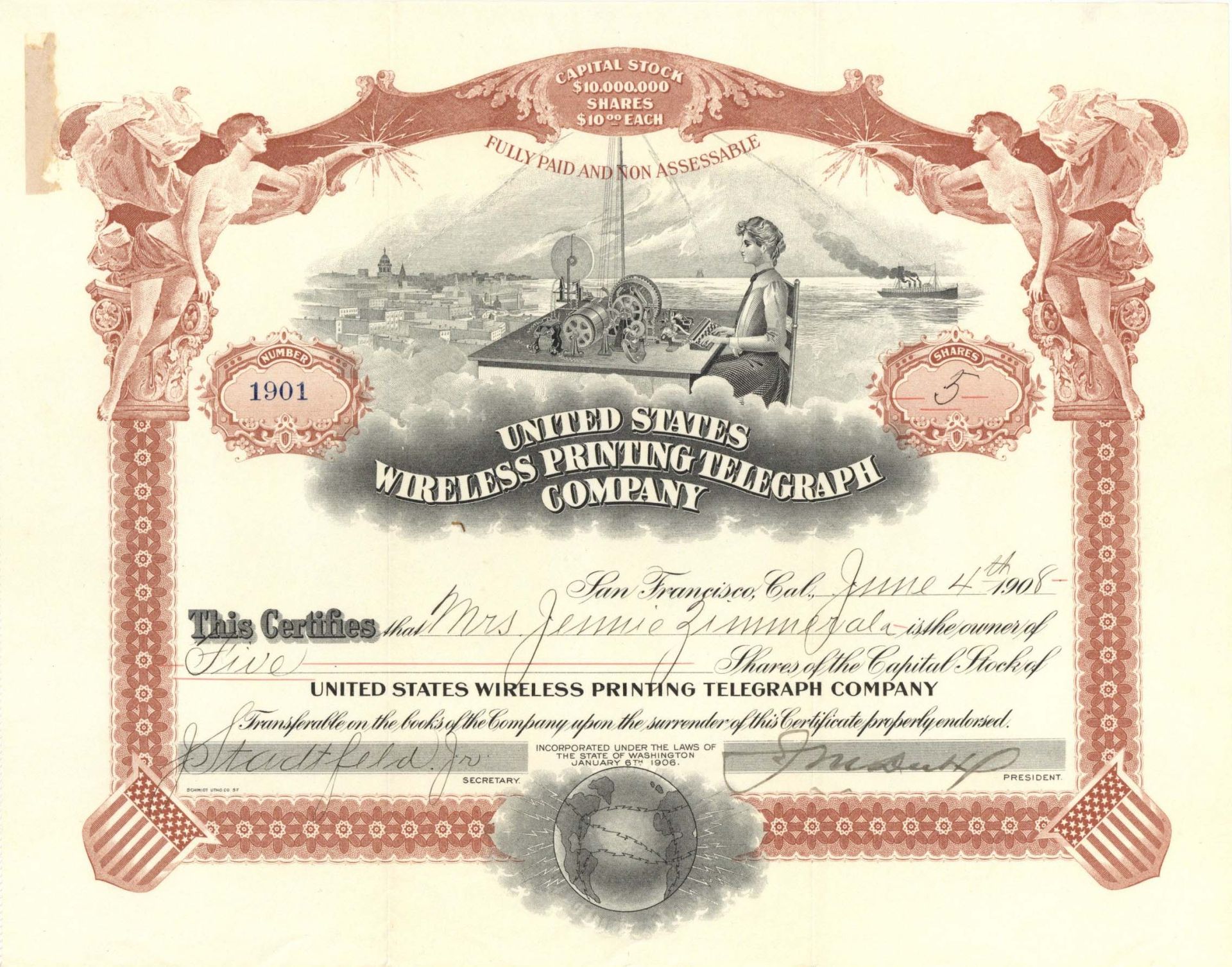 United States Wireless Printing Telgraph Co. - 1908 dated Stock Certificate