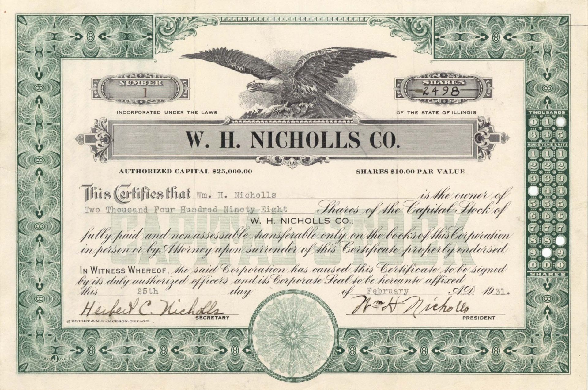 W.H. Nicholls Co. - 1931 dated Stock Certificate
