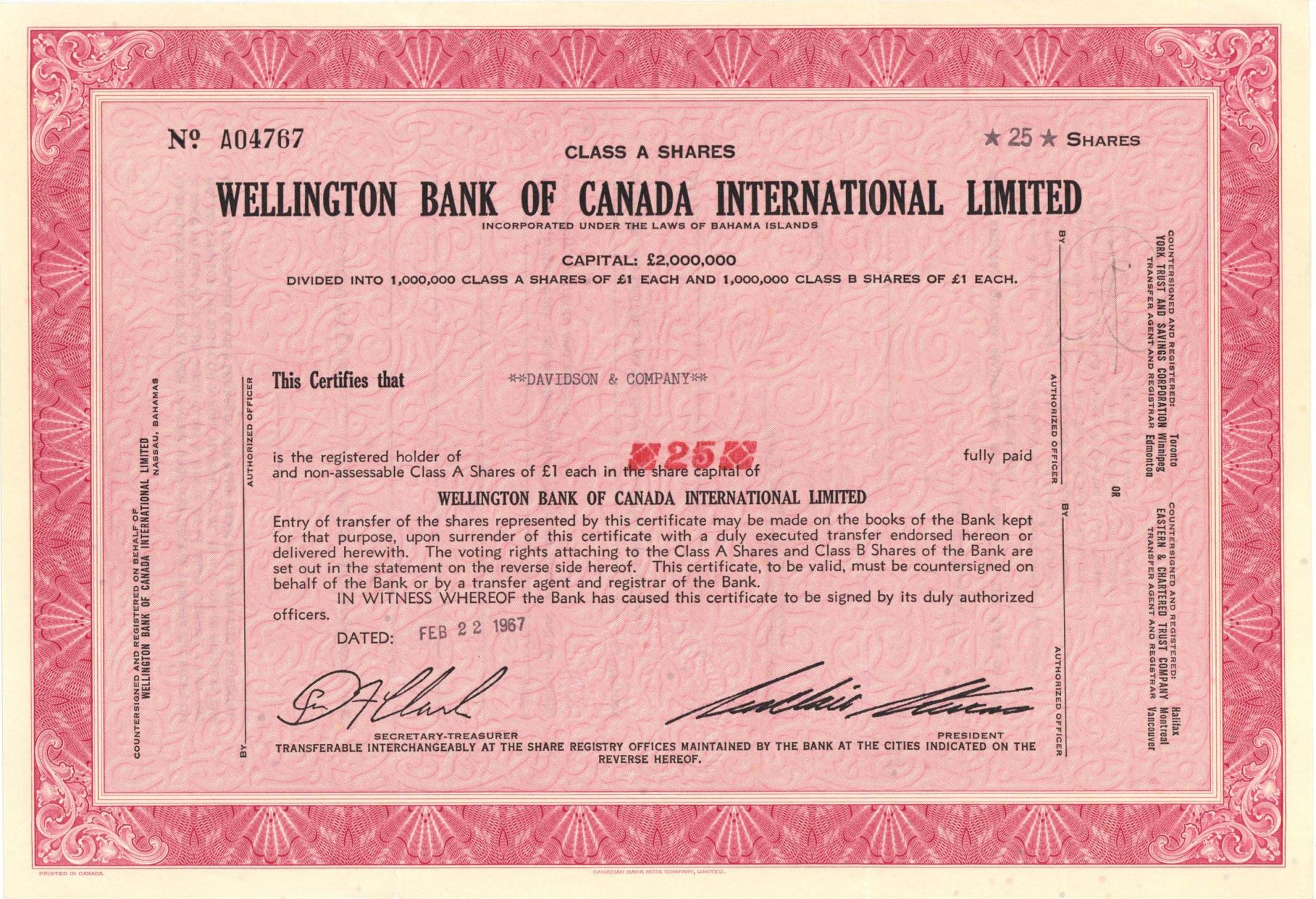 Wellington Bank of Canada International Limited - 1967 dated Stock Certificate