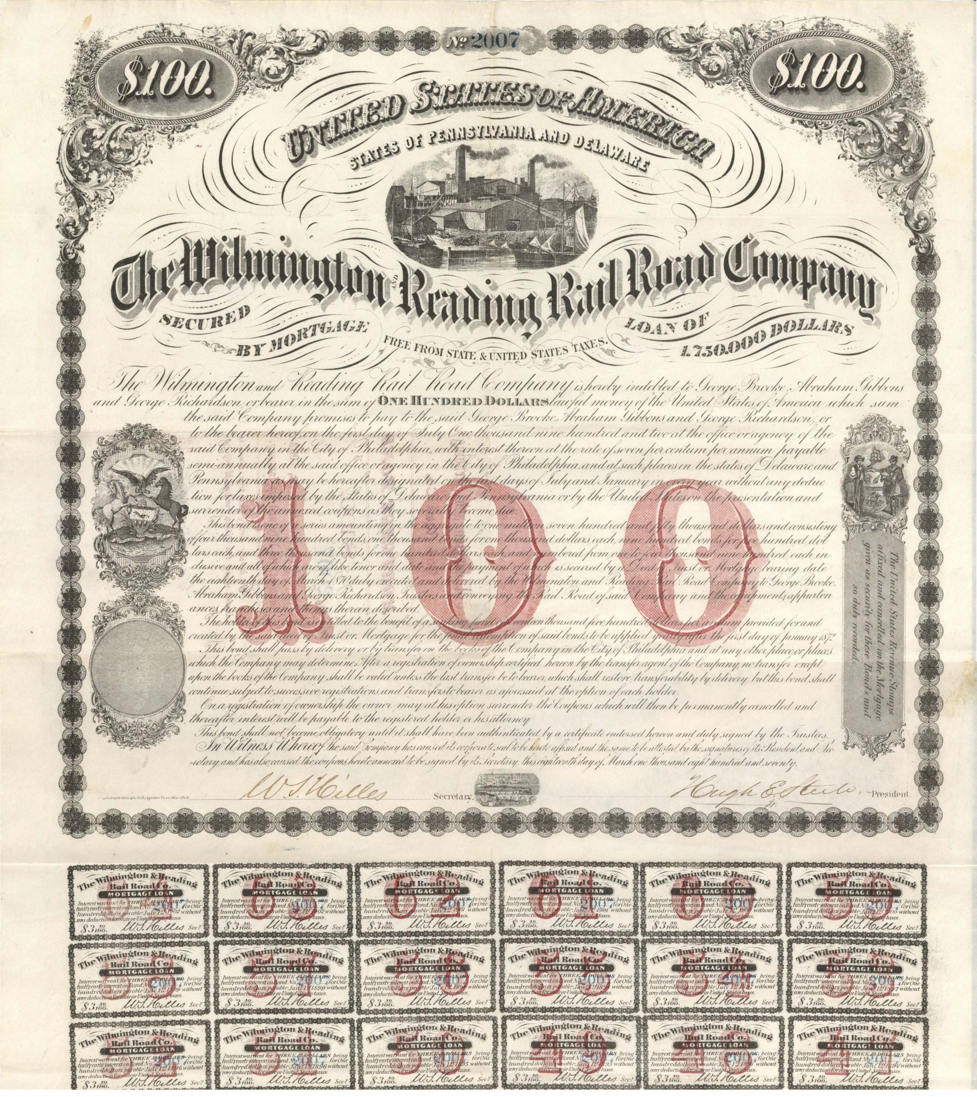 Wilmington and Reading Rail Road Co. - 1870 dated $100 Bond
