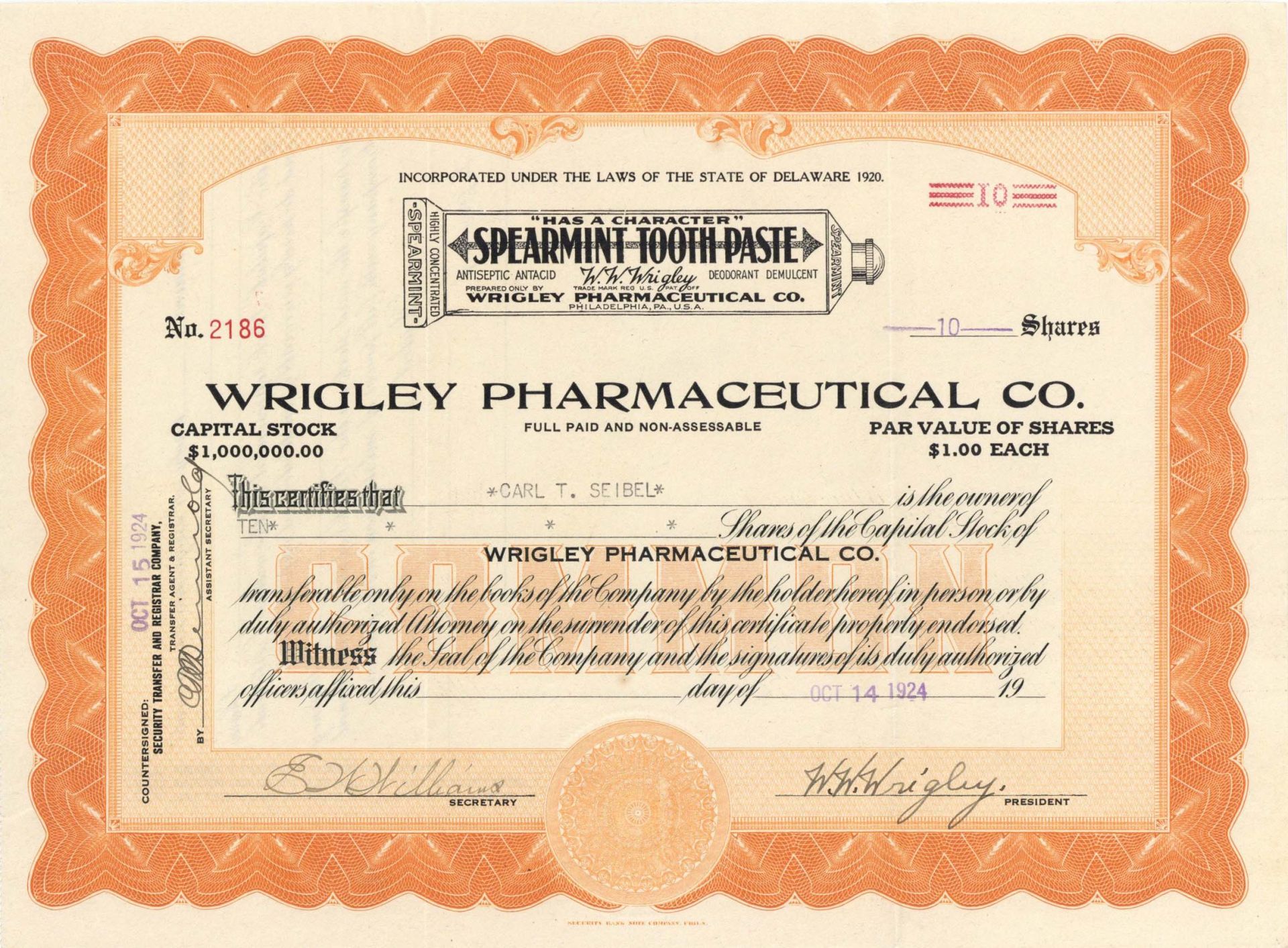 Wrigley Pharmaceutical Co. signed by W.W. Wrigley - Not the Famous Chewing Gum Magnate - 1924 dated Autographed Stock Certificate