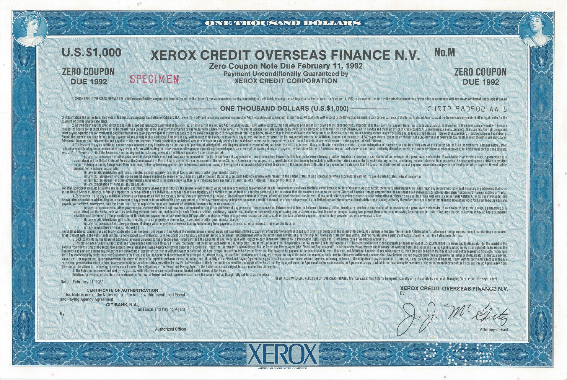 Xerox Credit Overseas Finance N.V. - 1982 dated Specimen Bond